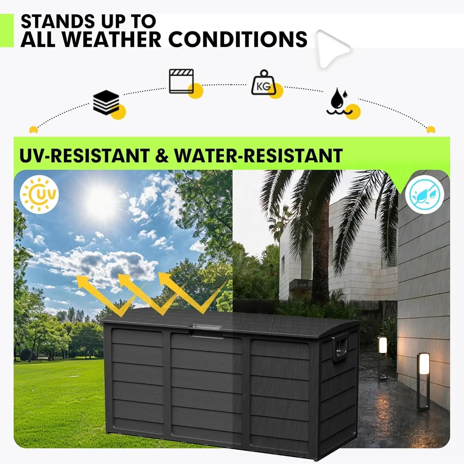 ·【High-quality material】The patio deck box is made of eco-friendly resin material and features excellent water resistance, being less prone to fading, rusting, peeling or bending.