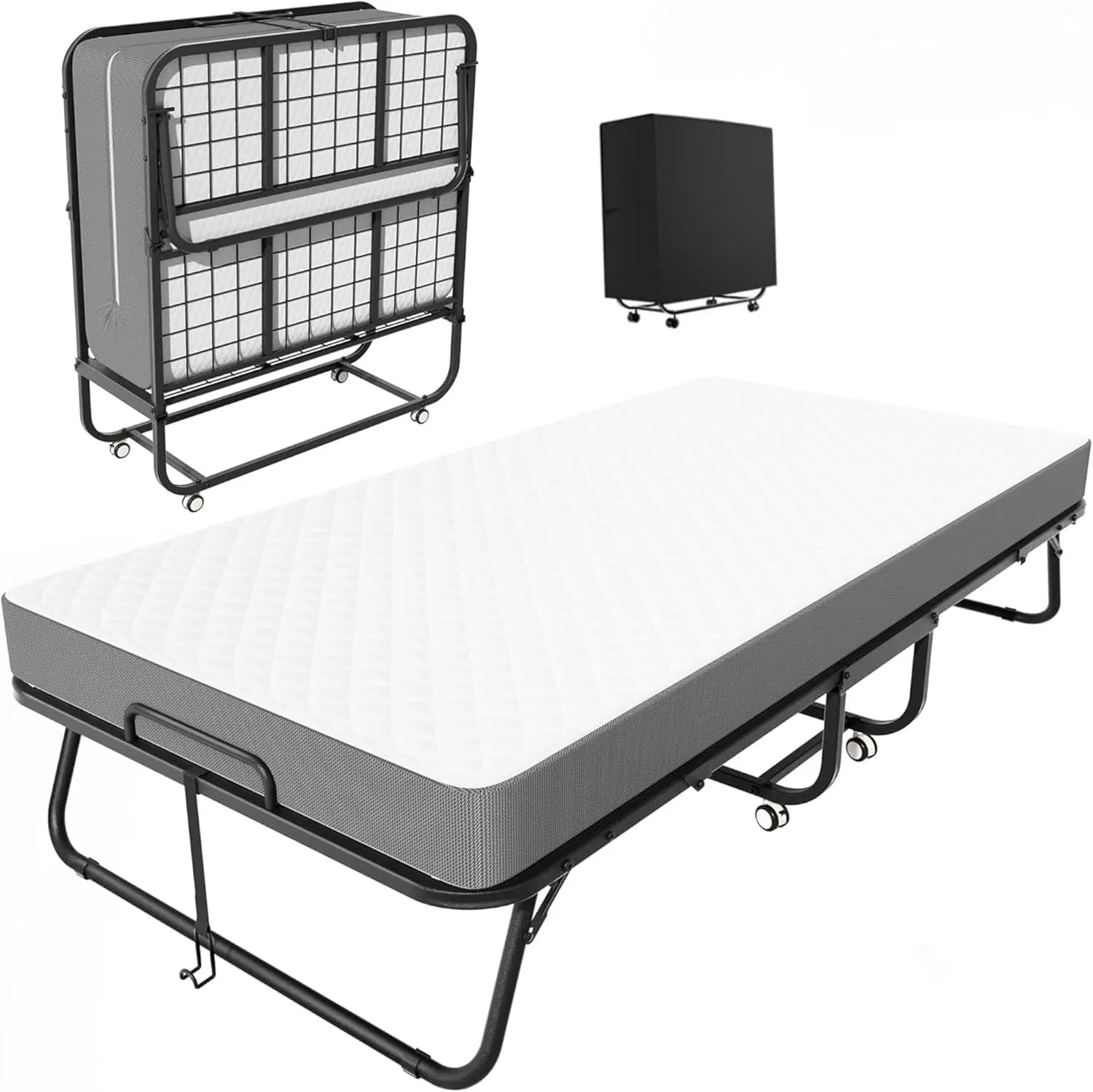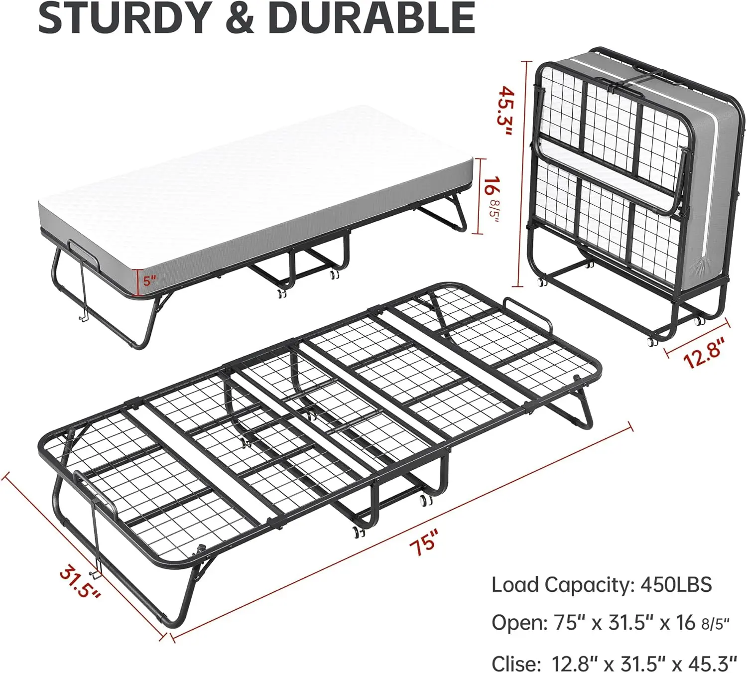 ·【Foldable, Moveable and Portable】This roll away bed can be easily folded by one person into a slim 14-inch thick shape to fit in a closet, under a bed or in a corner. Equipped with 4 lockable casters that swivel 360 degrees, you can easily transport and store this Foldaway bed anywhere.