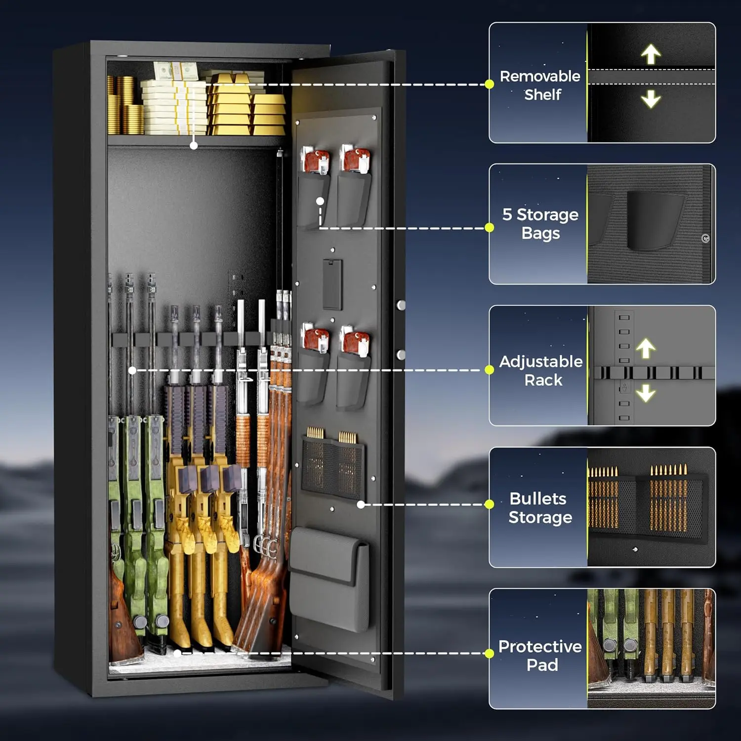 ·Adjustable Gun Racks for Customized Storage: Features adjustable gun racks that allow you to customize the interior layout to accommodate 8-12 guns of various sizes including rifles, shotguns, and pistols