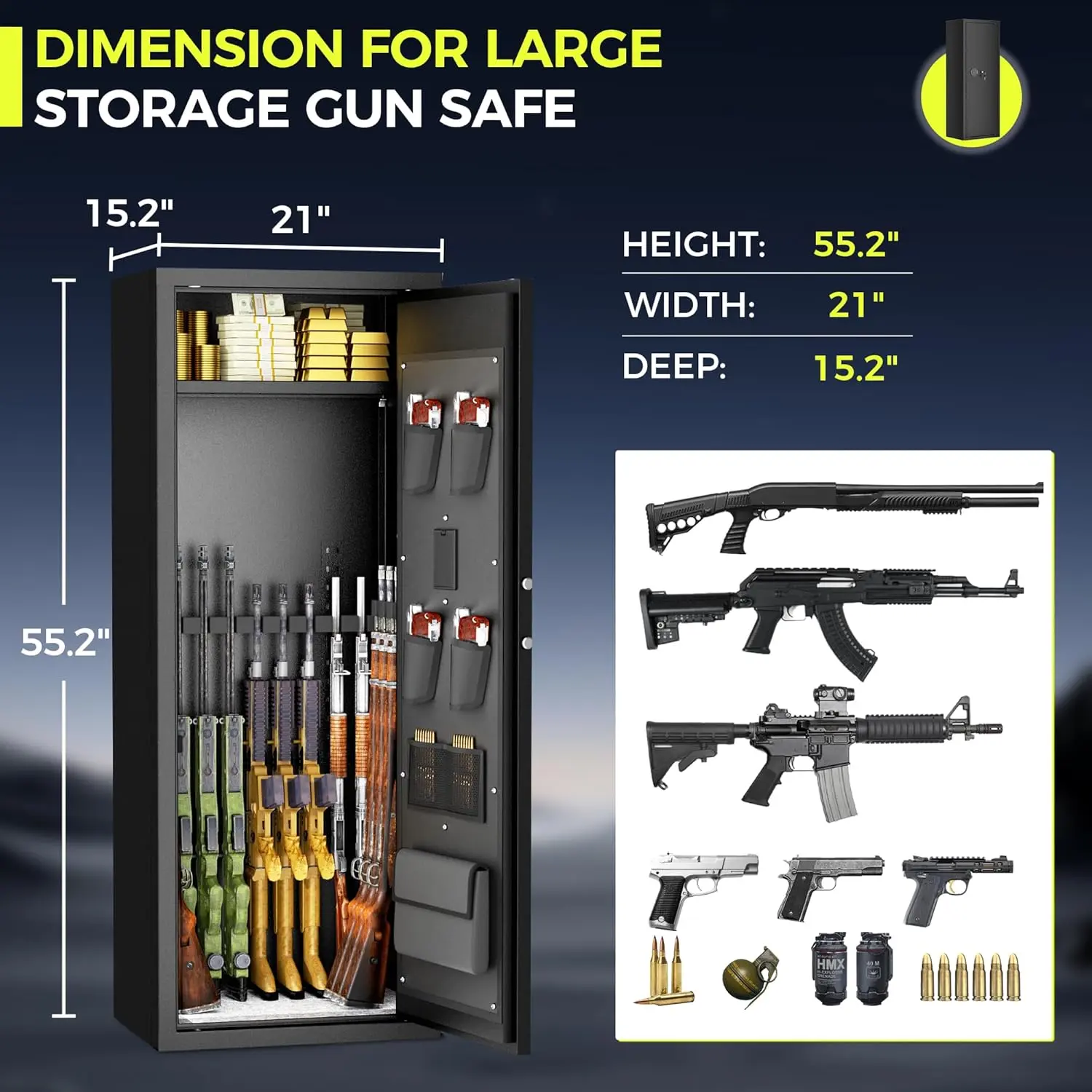 ·Super Storage Space Gun Safe: Gun cabinet size: H55.2" X W21" X D15.2", Compared with similar products, it has a deeper and wider storage space, and has two layers of storage space. If you feel that the height of the lower layer is not enough, you can remove the middle partition so as to reach the corresponding height of your gun, so that you can make full use of the storage space