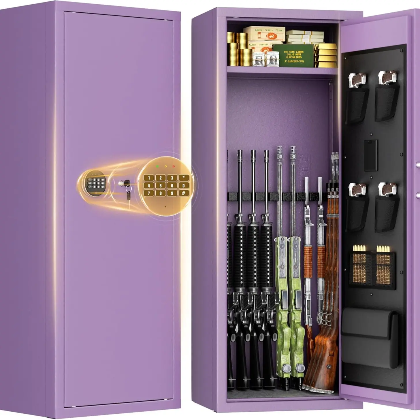 ·Three Ways to Open Gun Safe for Rifle and Shotguns: Digital keyboard + Knob, Key + Knob, Emergency battery box + Knob, three ways to open, multiple locking system, more effective protection of firearms safety