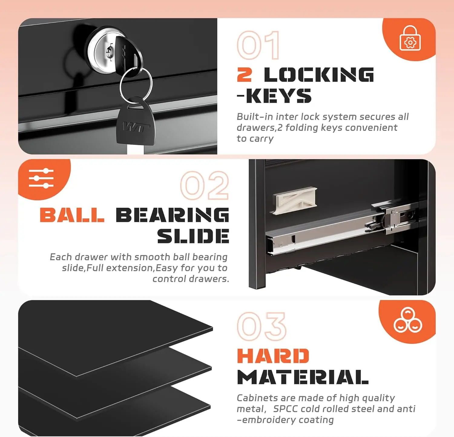 ·【Humanized Design Makes Work Much Easier】:No loud bangs and crashes, black lateral file cabinets have 4 anti-collision reinforcements, keeping quiet while protecting the cabinet. high-quality ball bearing glides for easy to open and close the drawer cabinet. Non-mar padded base prevent from sliding and scratching floors, provides extra stability & durability.