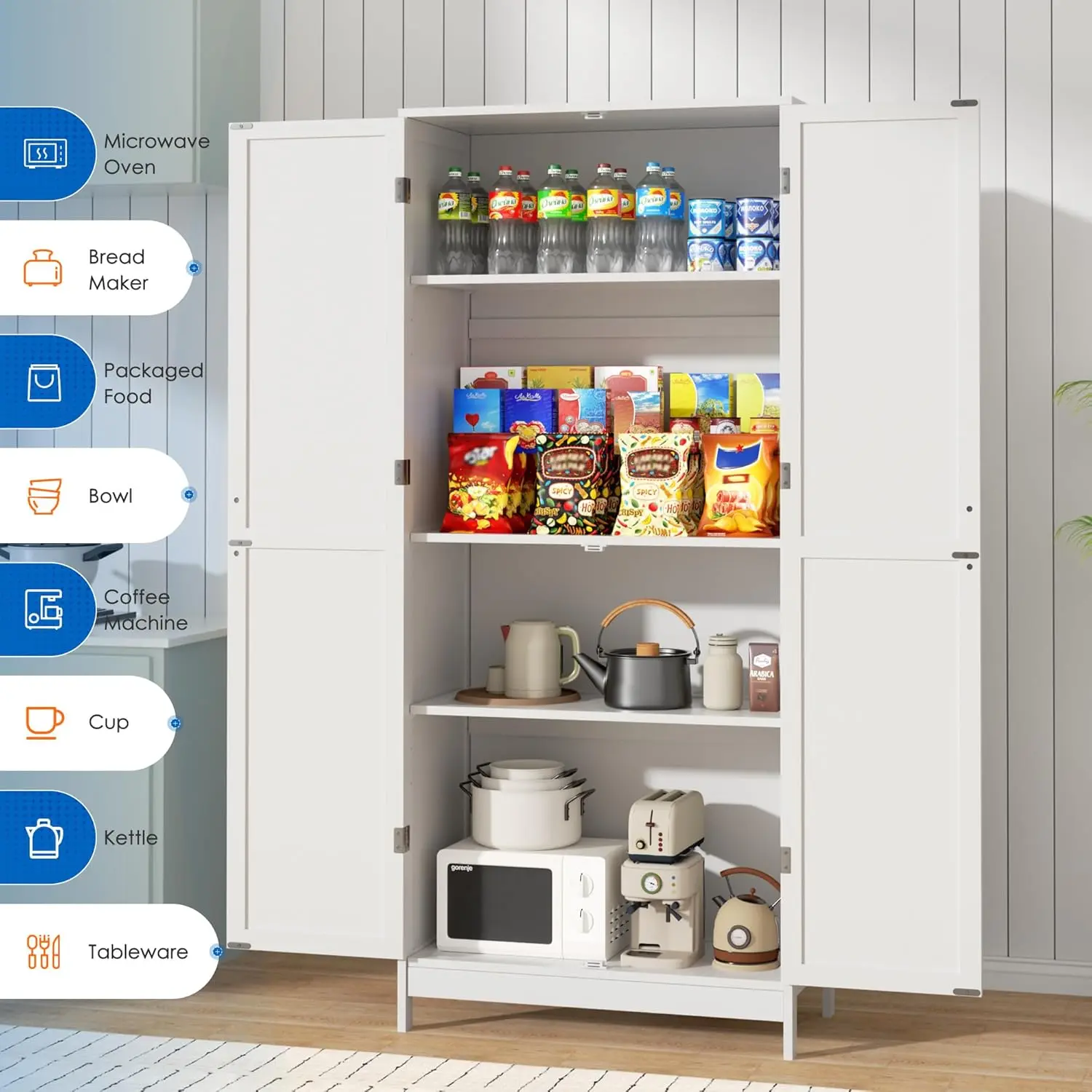 ·『Stability and Safety』: The tall kitchen cabinets with doors and shelves reserved for screw holes and equipped with screws in the package, can be fixed to the wall to increase safety and stability,even when subjected to external forces, ensuring the safety of you and your family