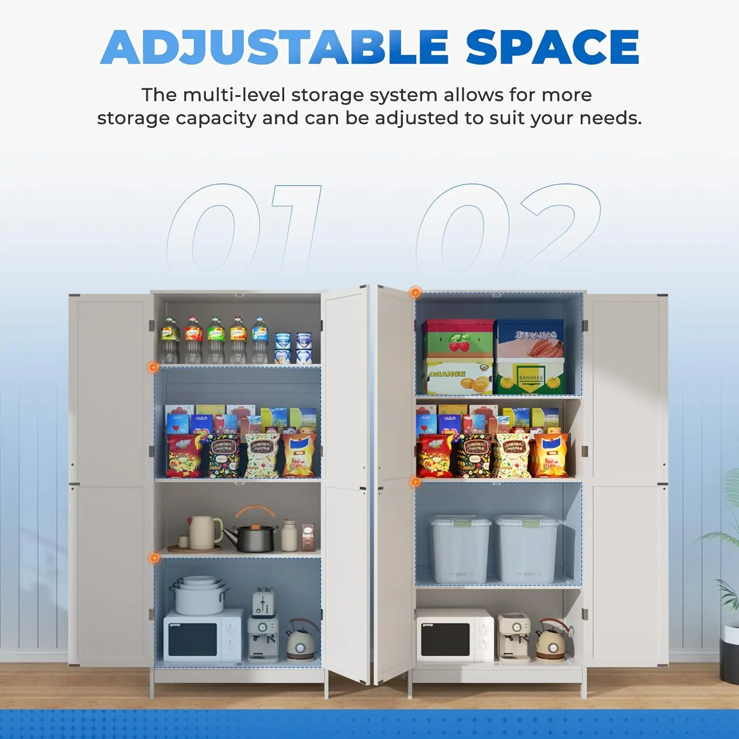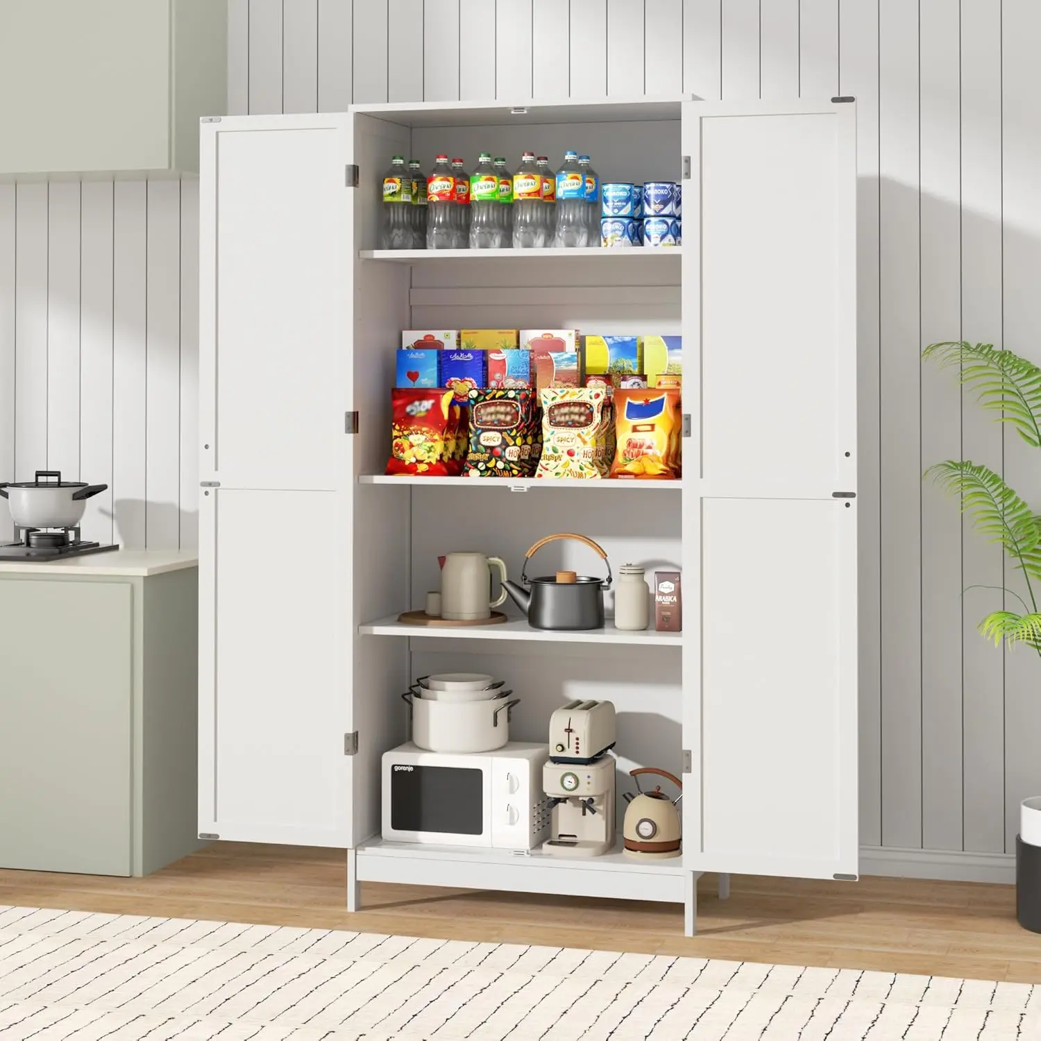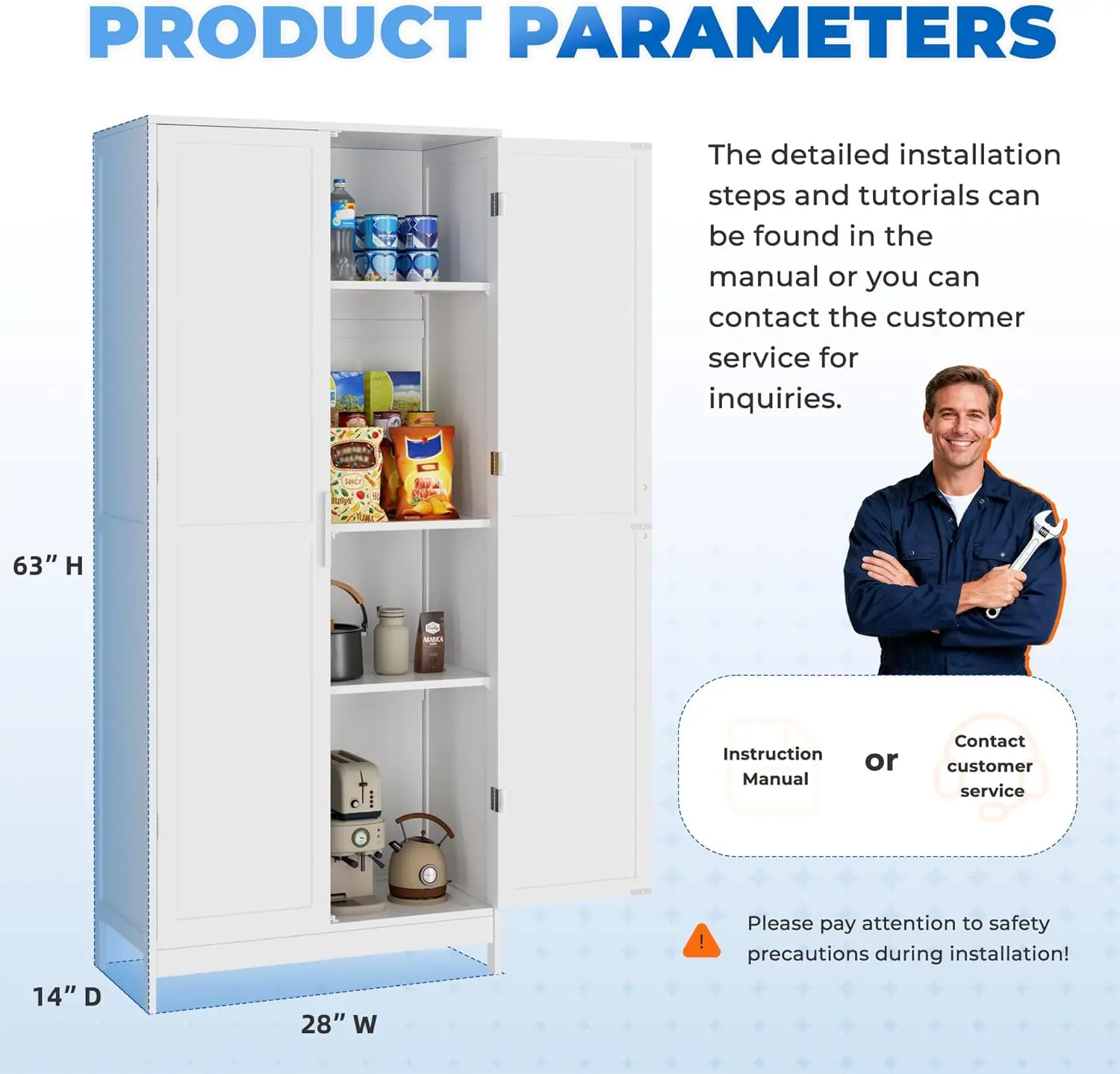 ·『DIY Storage Space』: After assembling, this pantry storage cabinet boasts dimensions of 63”H x 28”W x 14”D, with 4 tiers of space and 2 fully adjustable shelves, creating a versatile storage solution that can easily accommodate any item you want to store
