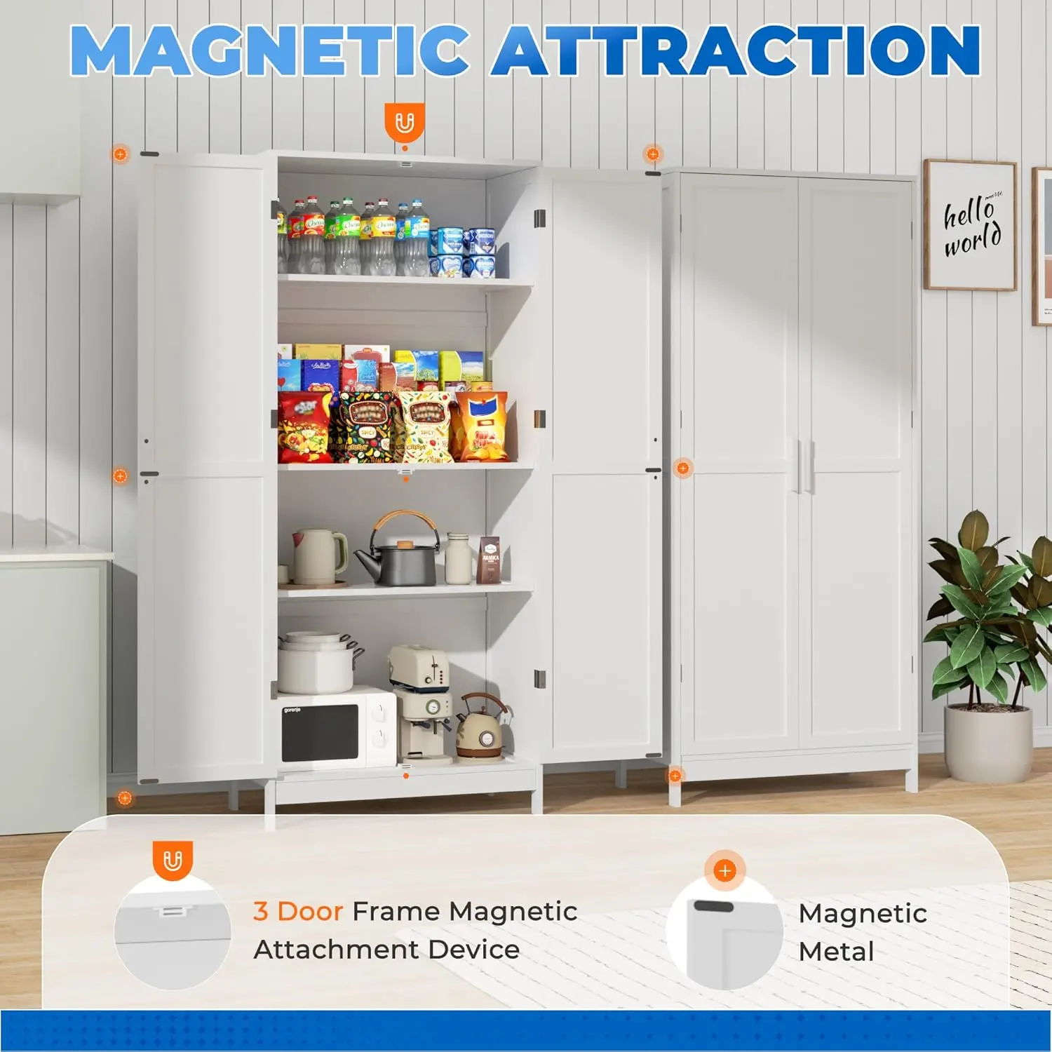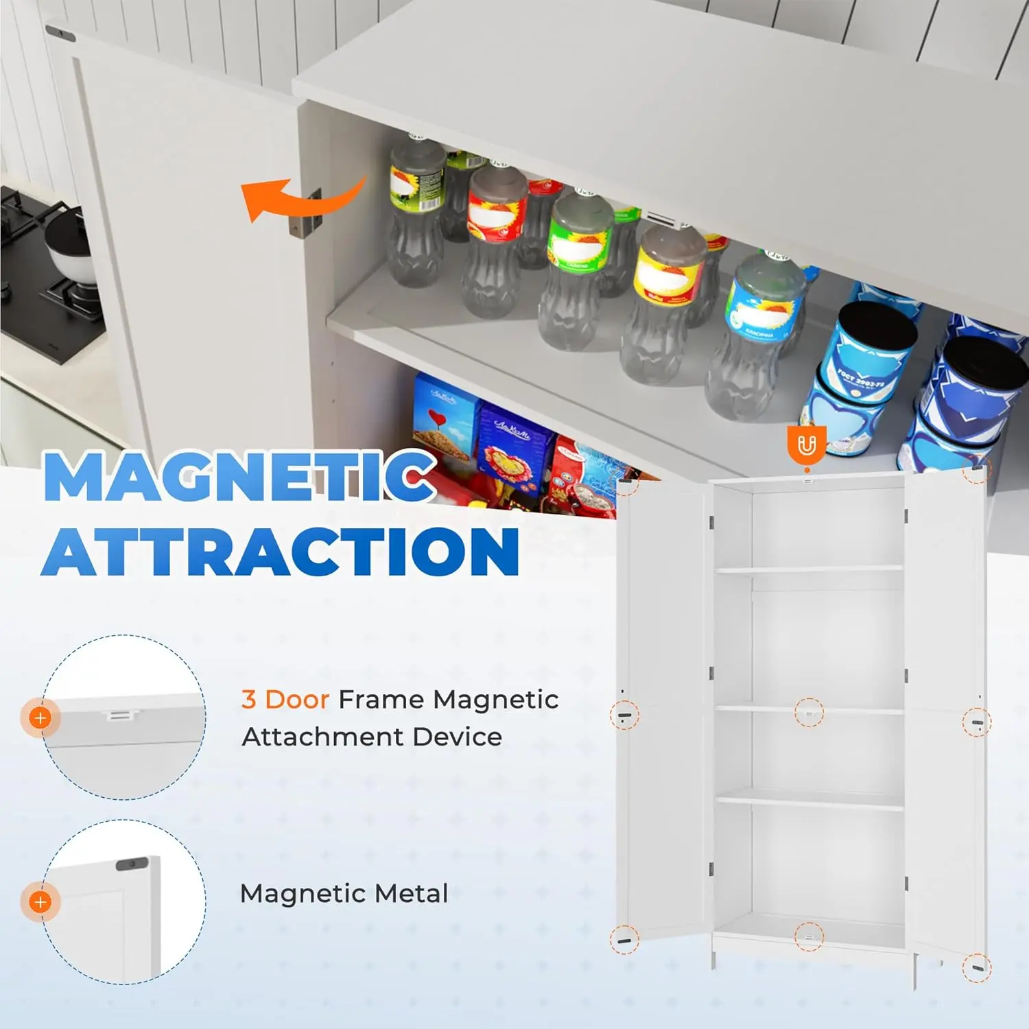 ·There are three magnets on the top, middle, and bottom of the panel of this white cabinet. You can close the door easily, also, door magnets ensure a silent, gentle close. Cabinet keeps dust and kitchen odors out while protecting against moisture