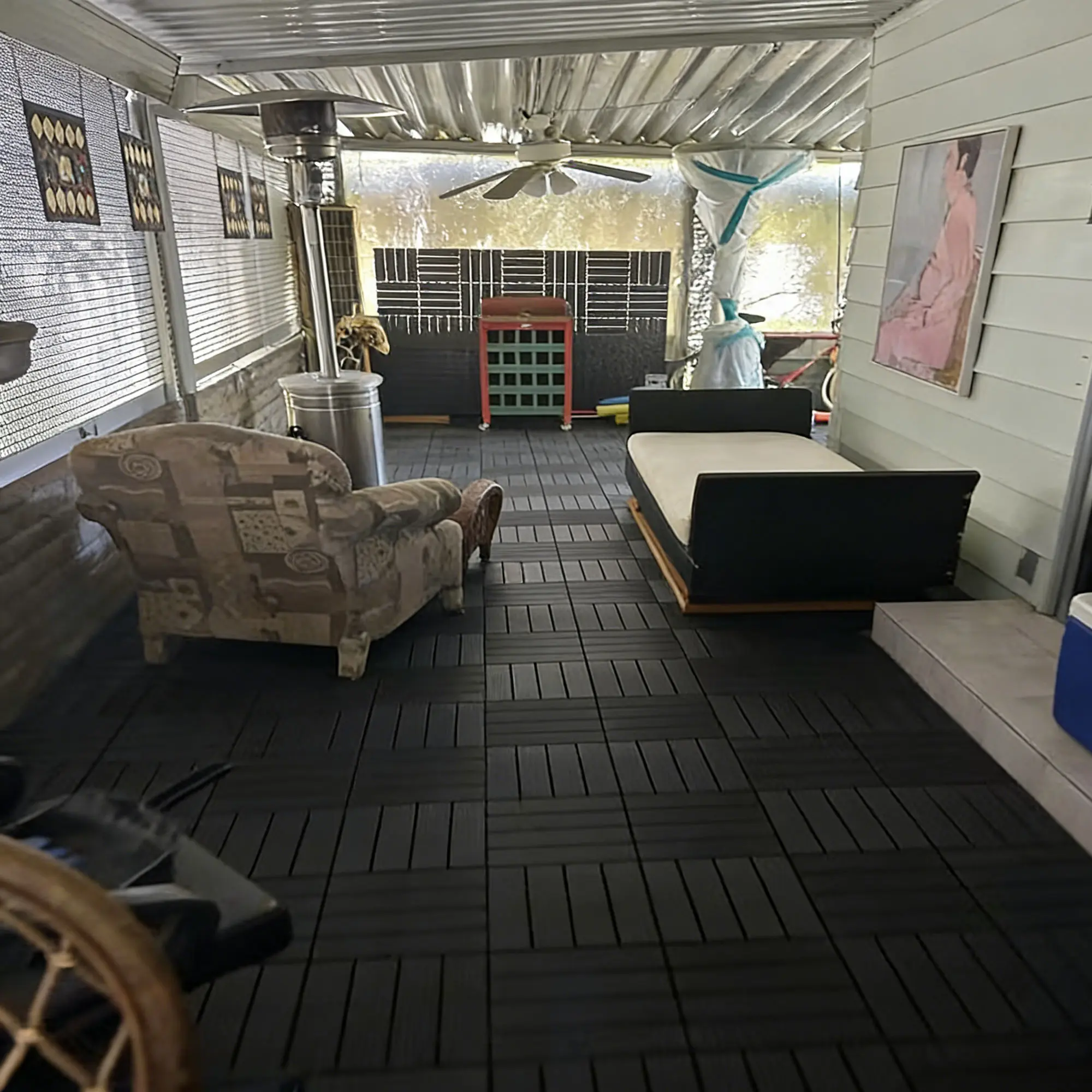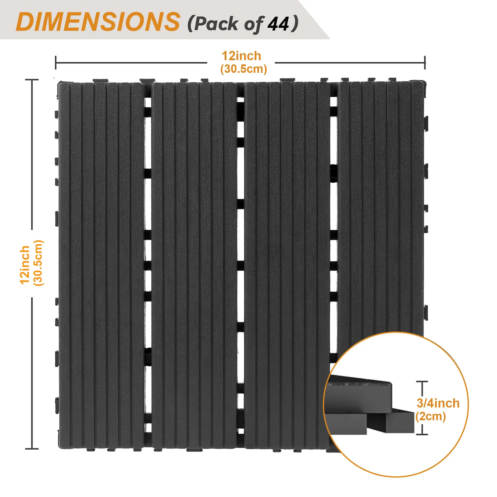 ·44 sq.ft.Coverage: Each set includes 44 tiles, measuring 12 x 12 inches, ideal for covering large outdoor patios, porches, poolside areas, or indoor showers and laundry rooms.
