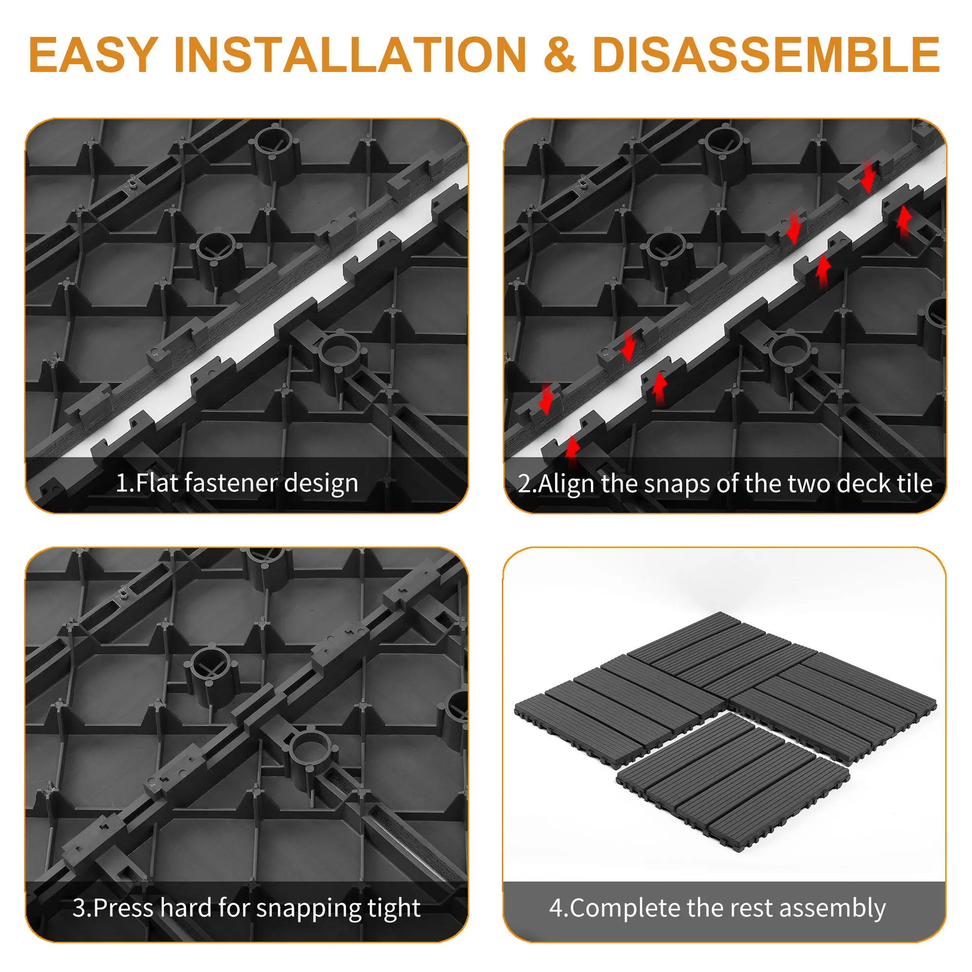 Simply snap the tiles together for quick installation.You can also use a power saw for cutting and reassembling.Regular maintenance is as easy as rinsing them off.