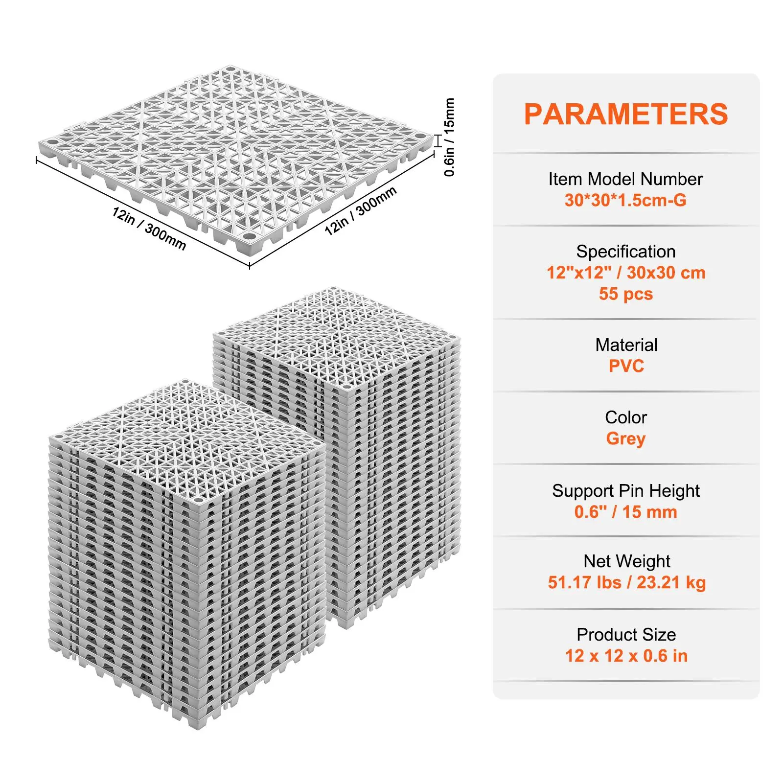 • Efficient Drainage: Our 55 interlocking drainage mats, each measuring 12x12 inches, feature upgraded 0.6-inch (15 mm) support pins to ensure rapid water drainage. Say goodbye to bothersome surface water buildup and enjoy a fresher, odor-free environment. These waterproof drainage floor tiles provide a non-slip surface for added safety.