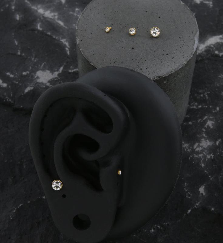 Sparkling internally threaded top piece to add to your piercing! Made from gold pvd on 316L stainless steel with clear CZ gems, this internally threaded top works with 16G piercings. Clear CZ gems available in 2mm, 3mm, and 4mm. The 16G features an M0.8 threading. Sold individually (1pc).