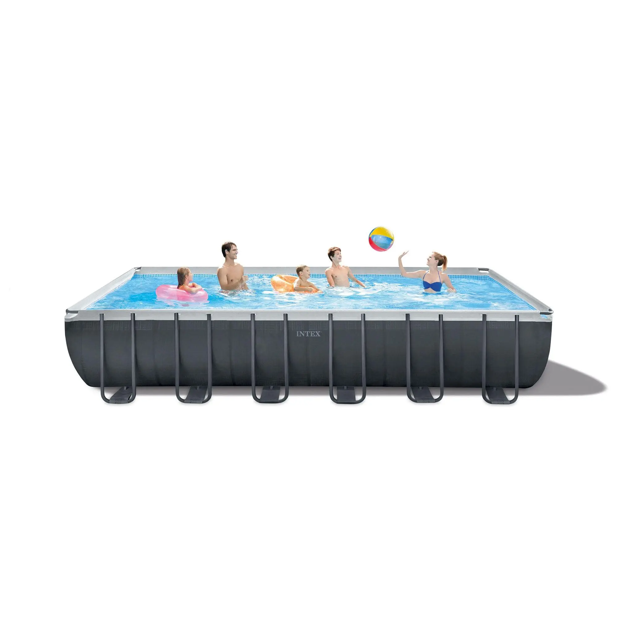 Make the most out of your summers and make a splash with the Intex 24-foot x 12-foot x 52-inch Ultra Frame Rectangle Pool Set.The rectangular swimming pool design is perfect for narrow backyards, lap swimmers, and pool games. The Ultra Frame design provides excellent durability and a sleek grey finish, all while making setup quick and easy. This pool includes everything you need for a great pool experience, including a ladder, debris cover, ground cloth, and the powerful Krystal Clear 110-120V, 2,100 gallon per hour sand filter pump.The Krystal Clear Sand Filter Pump saves you time, money, and frustration. The sand filter function replaces the need to buy expensive filters by only needing routine back washing and replacement sand every 5 years.Swim your summer days away and have a blast in the water with this Intex Ultra Frame Rectangular Pool Set.Note: Requires flat, level ground for proper installation.Disclaimer: Please review your HOA rules and restrictions before purchasing this product. Not all housing agencies permit private above-ground pools.