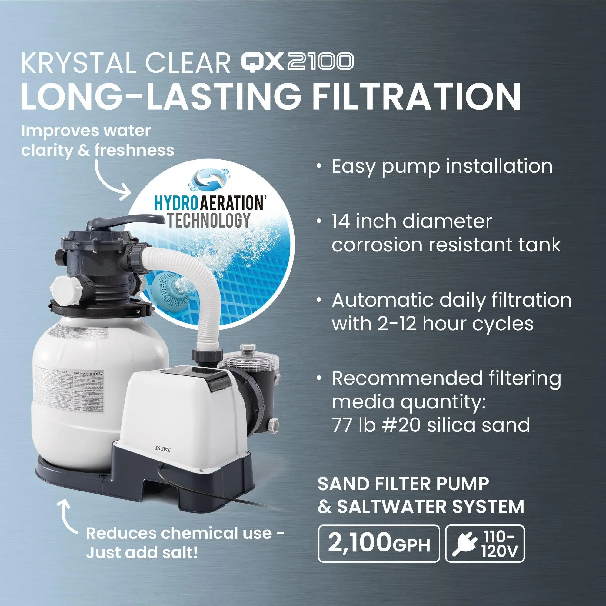 Sand filter pump and the salt water system has a pump flow rate of 1,600 gallons per hour that needs routine backwashing and replacing every 5 years