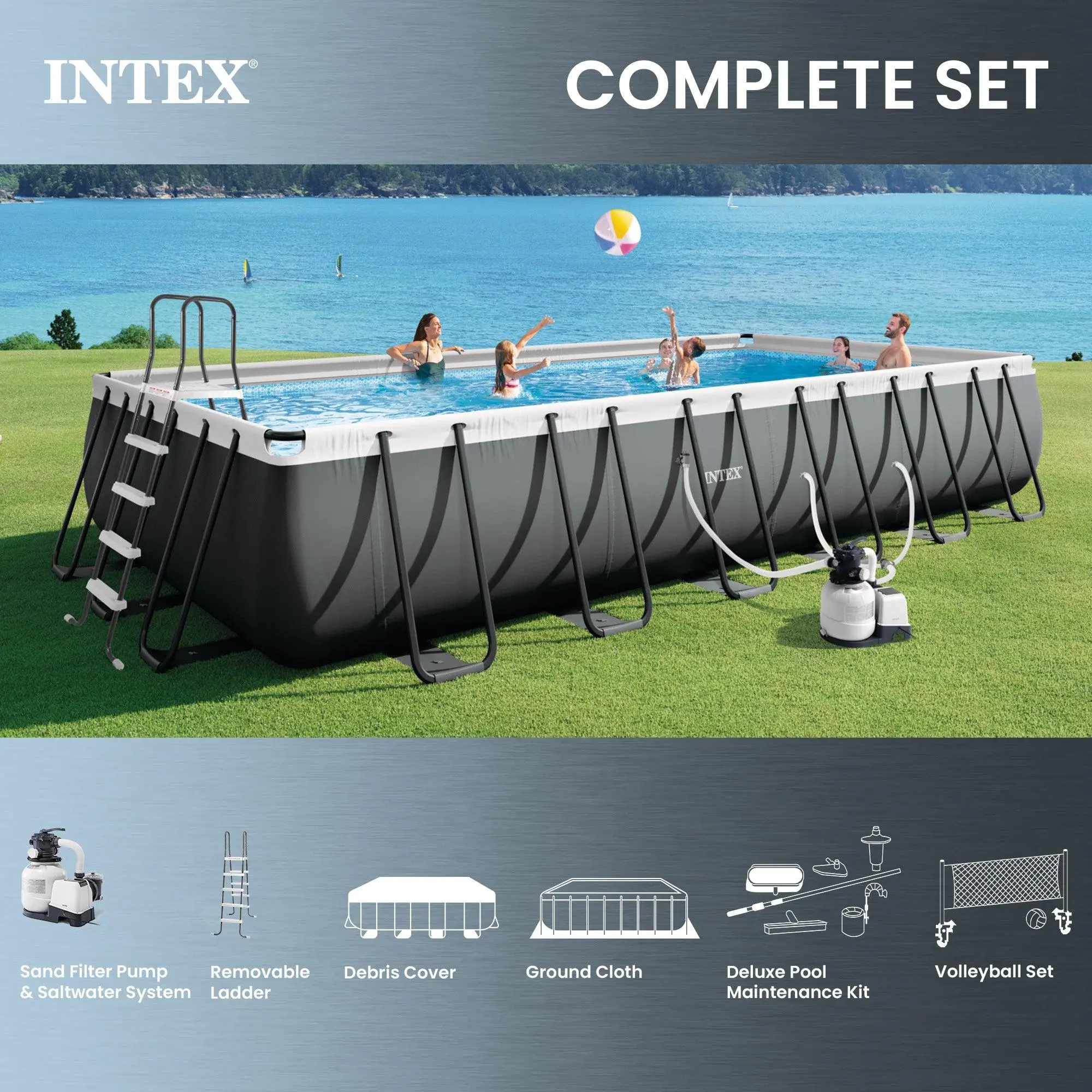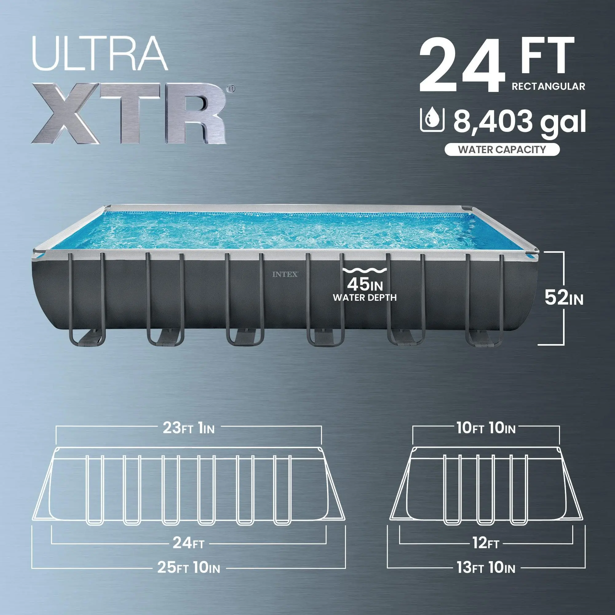 Make the most out of your summers by having fun splashing around the Rectangular Ultra Frame Swimming Pool Set from Intex. The rectangular 24' x 12' x 52" swimming pool design is perfect for narrow backyards, lap swimmers, and pool games. You'll need 25' 10" x 13' 10" x 52" of space for proper set up. The Ultra Frame provides excellent durability and a sleek finish, all while making setup quick and easy. You'll have everything you need for a great pool experience, including a salt water system, ladder, ground cloth, and Krystal Clear 110-120V, 1,600 gallons per house sand filter pump to ensure you have everything you need for a perfect outdoor pool day. The Krystal Clear sand filter pump saves you time and frustration while ensuring simple maintenance around your pool. The sand filter function replaces the need to buy expensive filters by only needing routine backwashing, and the sand only needs replacing once every 5 years. Swim your summer days away and have a blast in the water with this Intex Ultra Frame Rectangular Pool Set.Note: Requires flat, level ground for proper installation and must be dismantled every winter. Check local zoning and permit requirements before purchase.Disclaimer: Please review your HOA rules and restrictions before purchasing this product. Not all housing agencies permit private above-ground pools.