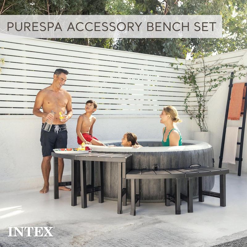 Add convenient storage or lounge area to your Intex PureSpa with this set of 4 Accessory Benches. With this set, you get 2 medium and 2 tall benches for your Intex Spa Setup.Compatible with 4 person spas, these benches can be combined to create a larger bench and provide wrap around seating or a flat surface for towels, snacks and drinks, or your guests. Combine with multiple packages of benches and create the seating and storage that makes your spa the most comfortable spot at your home. 16.5 inch height on the medium benches and 23.5 inch inch height on the tall benches gives this set a large enough profile for comfort, but not so large that they are cumbersome. Each bench has a weight capacity of 350 pounds, make it durable and sturdy enough to support your items. Please note it is not a step and should not be stood on or jumped from.For convenient storage, these benches store flat. Clean storage with quick and easy set up make these benches the simple accessory that takes your spa to the next level. Add this set of 2 Medium And 2 Tall Accessory Benches to your Intex PureSpa setup.