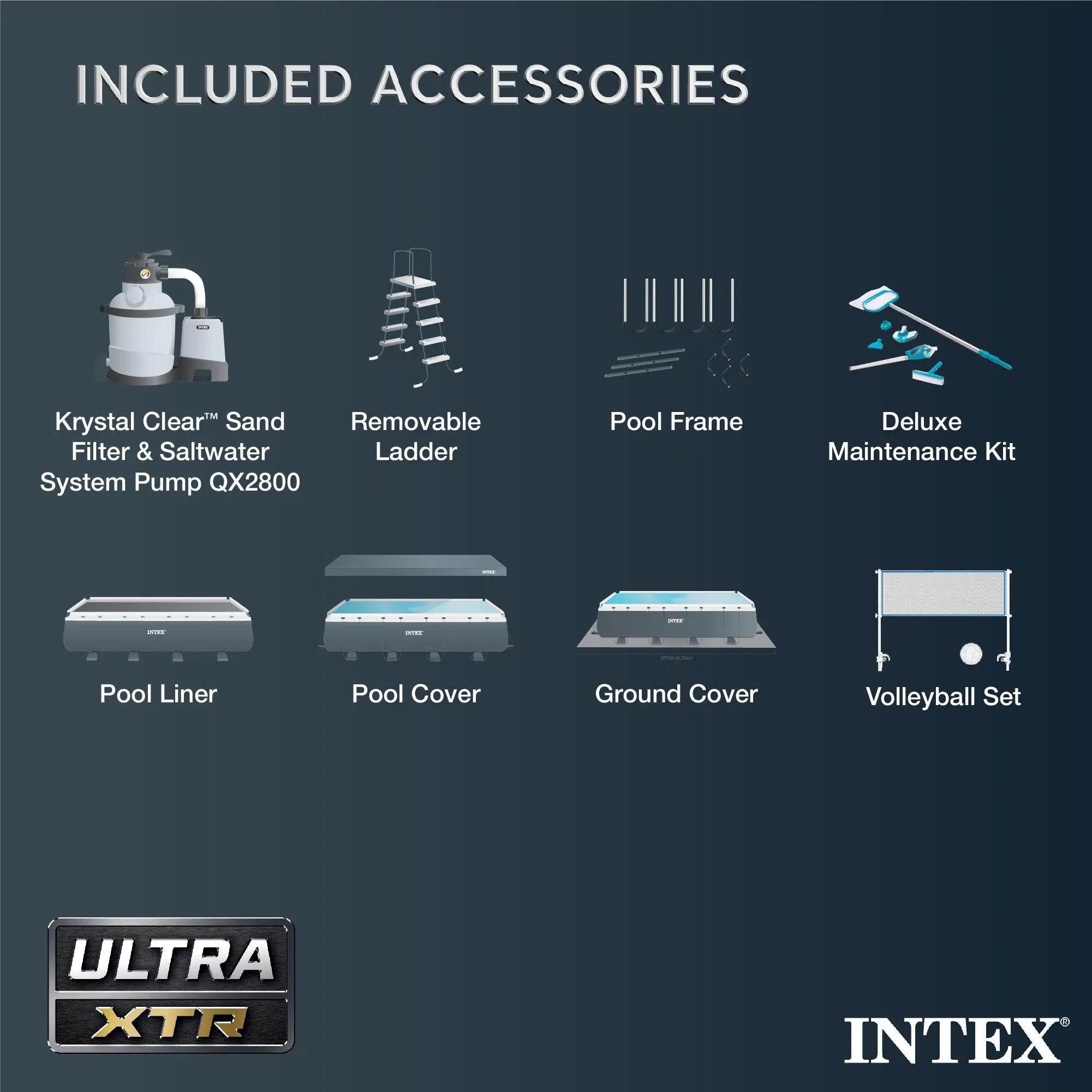 Make a splash this summer with the Intex Ultra XTR 32 Ft x 16 Ft x 52 Inch Rectangular Frame Pool Set.The rectangular swimming pool design is perfect for narrow backyards, lap swimmers, and pool games. The Ultra Frame design provides excellent durability and a sleek gray finish, all while making setup quick and easy. This pool includes everything you need for a great pool experience, including the powerful Intex 2,800 gallon per hour sand filter pump, ladder, debris cover, and ground cloth. The sand filter pump saves you time, money, and frustration. The sand filter function replaces the need to buy expensive filters by only needing routine back washing and replacement sand every 5 years.Swim your summer days away and have a blast in the water with this Intex Ultra Frame Rectangular Pool Set.Including several great tools, the Intex Deluxe Maintenance Kit keeps your pool water looking crystal clear. Maintenance is a part of every swimming pool and getting the right tools for the job cuts down on time spent cleaning. Using your existing filter pump, the included vacuum sucks debris from the pool floor. The deluxe skimmer collects floating debris while the leaf rake is great for skimming anything that is missed. A clean pool is a safe pool! Note: Requires flat, level ground for proper installation.