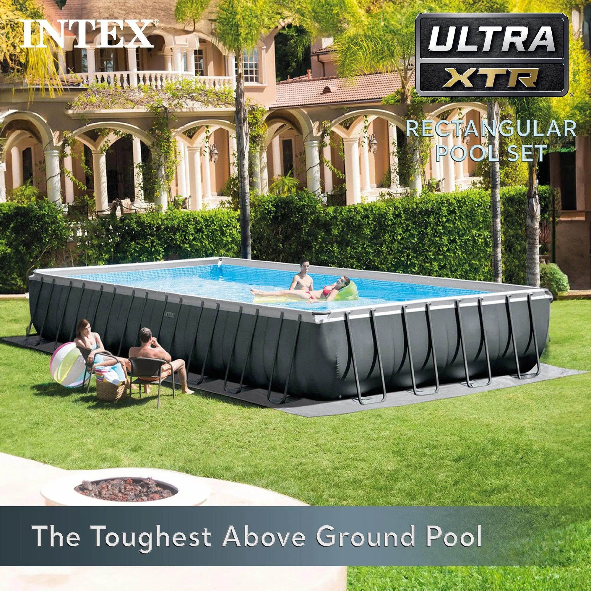 Make the most out of your summers and a splash this summer with the Intex 32-foot x 16-foot x 52-inch Ultra XTR Rectangular Frame Pool Set.Keep it clean week after week, party after party with the included Intex Deluxe Maintenance Cleaning Kit. Between the vacuum, the skimmer, and the telescoping pole, this handy kit includes everything you need for crystal clear looking water. The rectangular swimming pool design is perfect for narrow backyards, lap swimmers, and pool games. The Ultra Frame design provides excellent durability and a sleek gray finish, all while making setup quick and easy. This pool includes everything you need for a great pool experience, including a ladder, debris cover, ground cloth, and the powerful Krystal Clear 110-120V, 2,800-gallon per hour sand filter pump.The Krystal Clear Sand Filter Pump saves you time, money, and frustration, and replaces the need to buy expensive filters by only needing routine backwashing and replacement sand every 5 years.Swim your summer days away and have a blast in the water with this Intex Ultra Frame Rectangular Pool Set.Note: Requires flat, level ground for proper installation.Disclaimer: Please review your HOA rules and restrictions before purchasing this product. Not all housing agencies permit private above-ground pools.