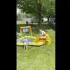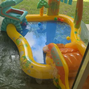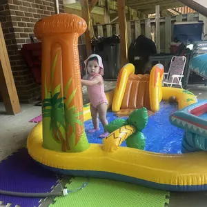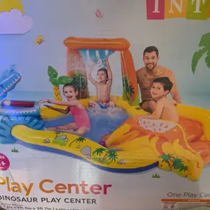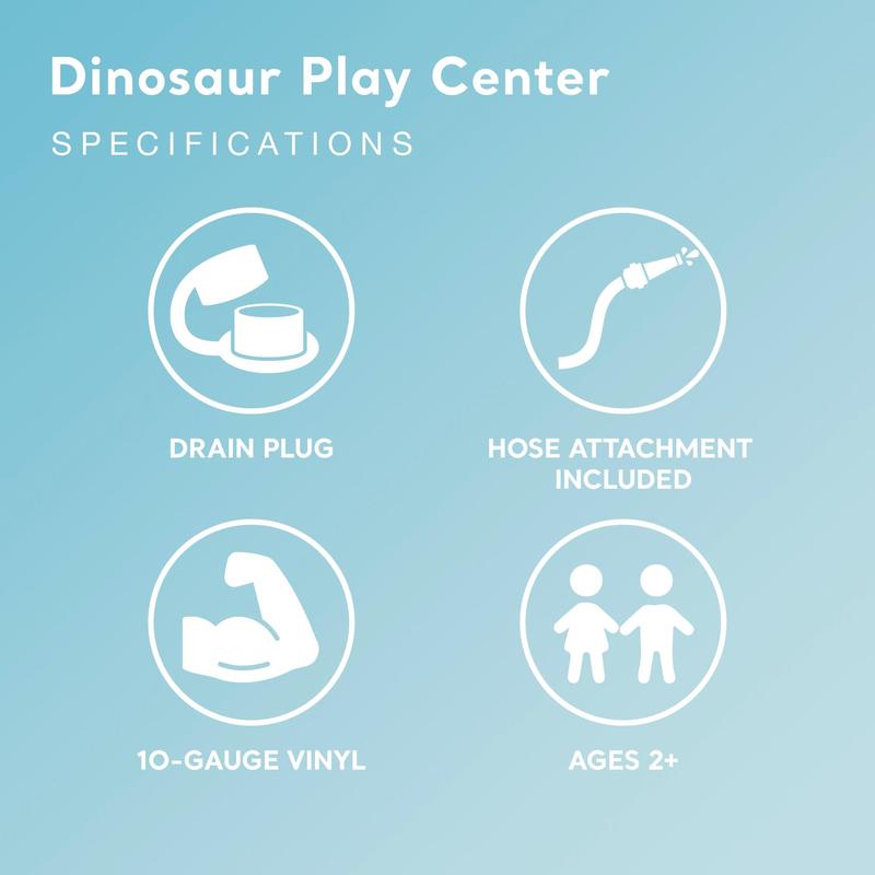 Have the best time playing and splashing with your kids in the Dinosaur Play Center Water Park Pool from Intex. Give your kids a fun experience they will not soon forget and be the talk of the neighborhood with this toddler outdoor water play center. Your kids are sure to keep cool in the wading pool with the built-in palm tree water sprayer and waterfall. Simply attach the play center to a standard garden hose for hours of entertainment and tons of enjoyment. Feed the hungry dinosaur with the 6 included colorful fun balls to keep your kids enertained during a warm Summer day or slide down the volcano water slide onto the soft landing mat for a safe landing and to keep cool. Constructed with durable 10-gauge vinyl materials, this kiddie pool will surely last through all the splashing fun. Quickly inflate the water park, fill it with water, and watch your energy-filled kids use their imaginations and create their own adventures. When finished playing, use the convenient drain plug to empty the pool and easily deflate it for efficient storage. In the event that a tear or puncture occurs, this Summer water play center comes with a heavy-duty repair patch for a quick and easy fix. Transform your backyard into an island adventure! Enjoy your hot summer days with the Intex Dinosaur Play Center Water Park Pool.