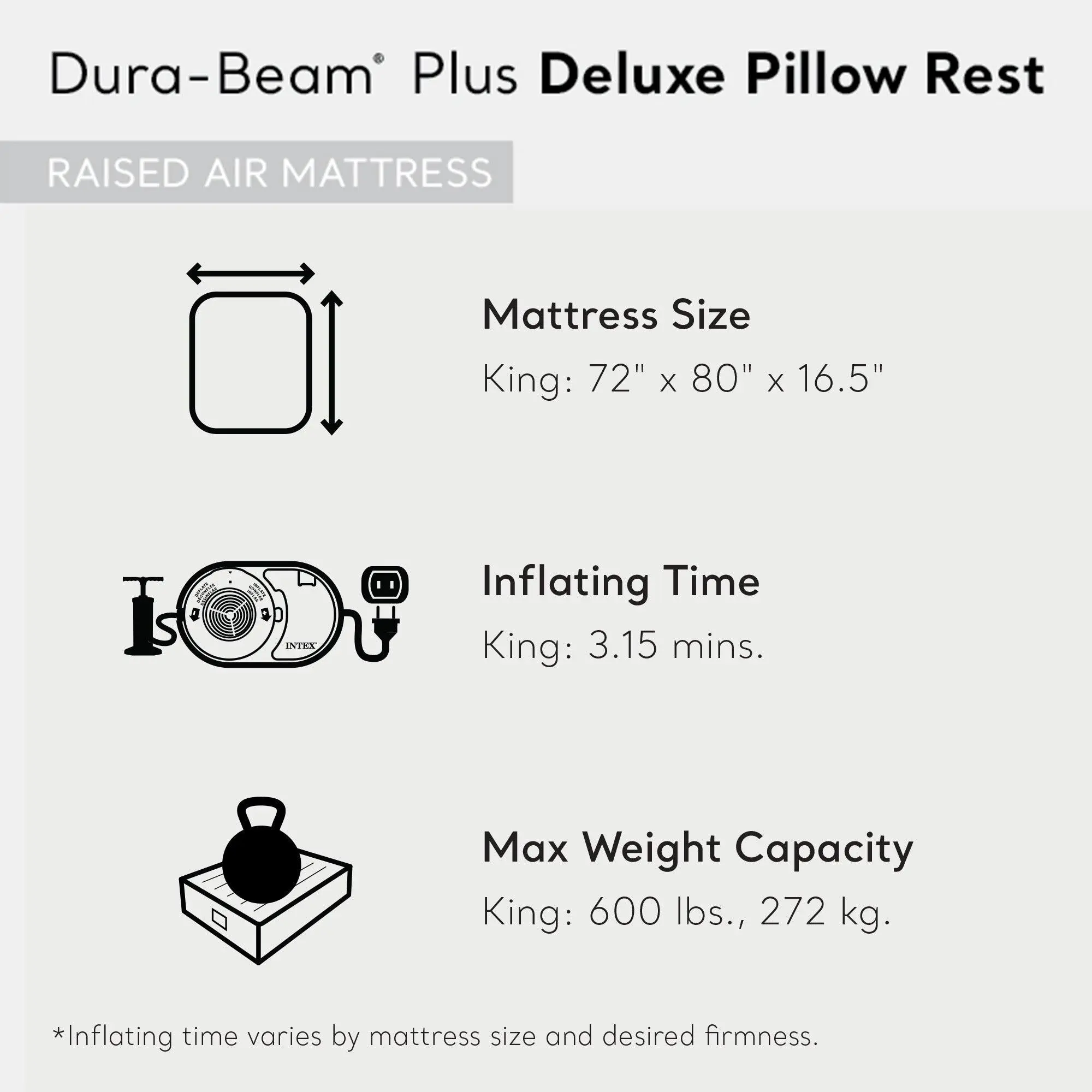 ·Quick Set-Up: With an inflating time of approximately 3.15 minutes, you can begin to use the air bed right away for a hassle-free setup.