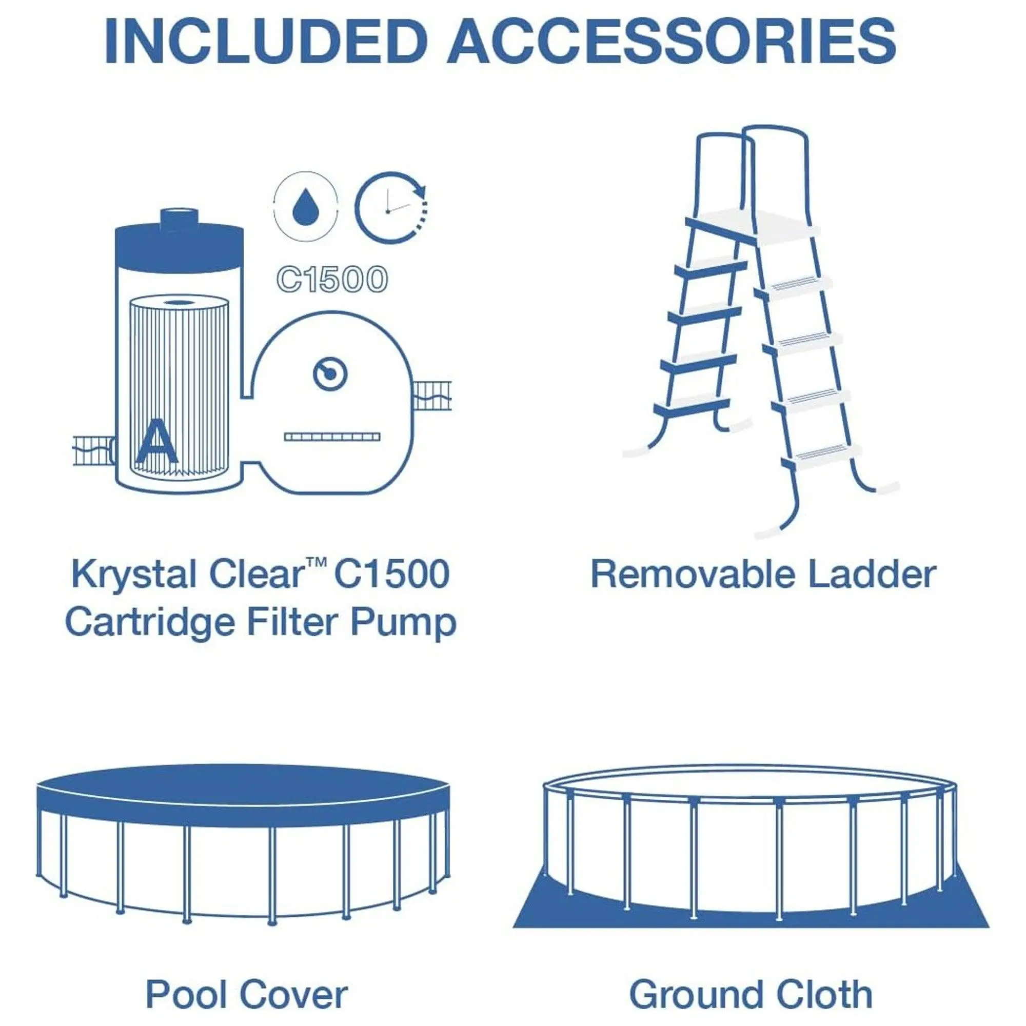 Includes cartridge filter pump, (1) Type A cartridge, pool ladder, ground cloth, debris cover