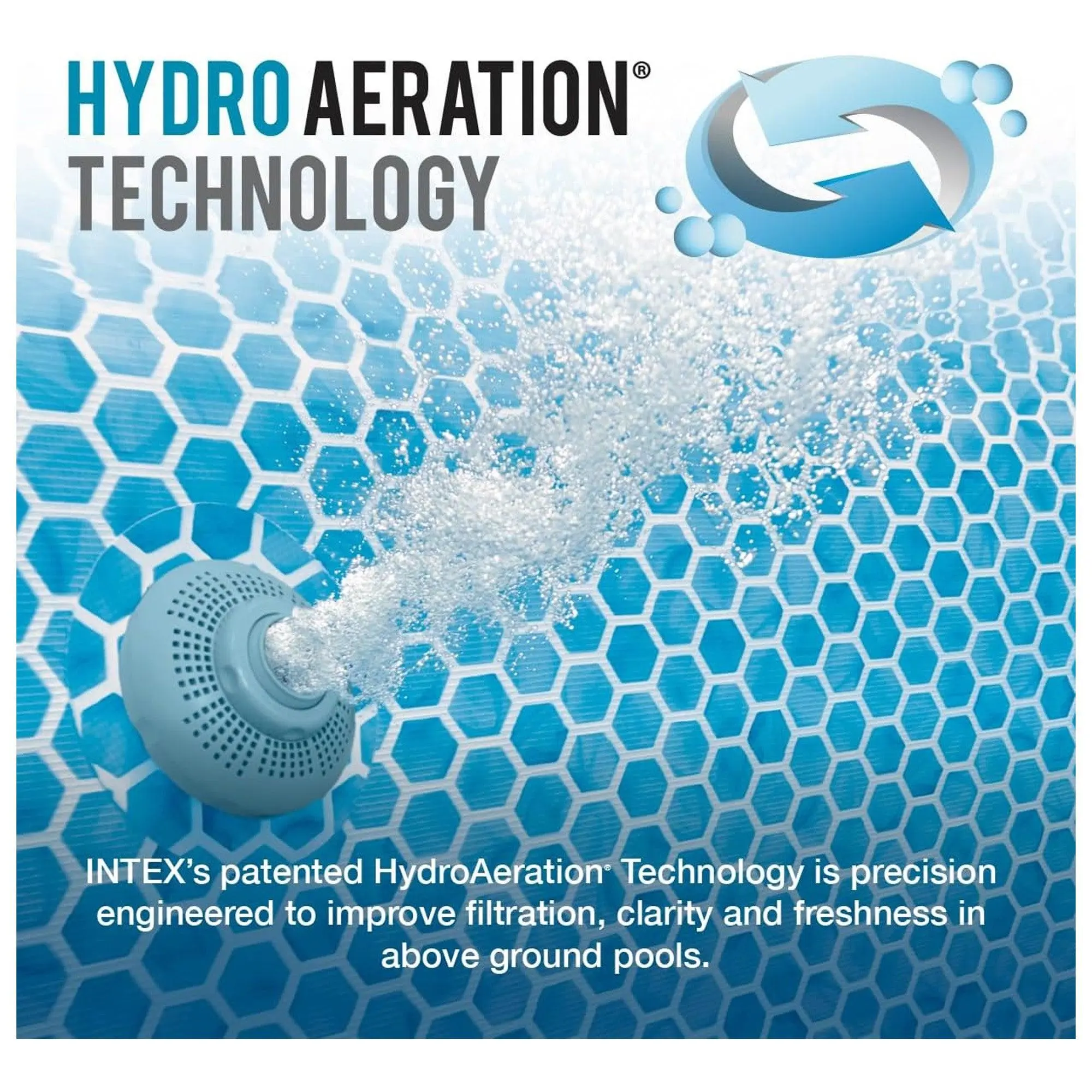 Intex 1,500 GPH filter pump features Hydro Aeration Technology for improved circulation, filtration, improved water clarity, and increased negative ions at the water surface