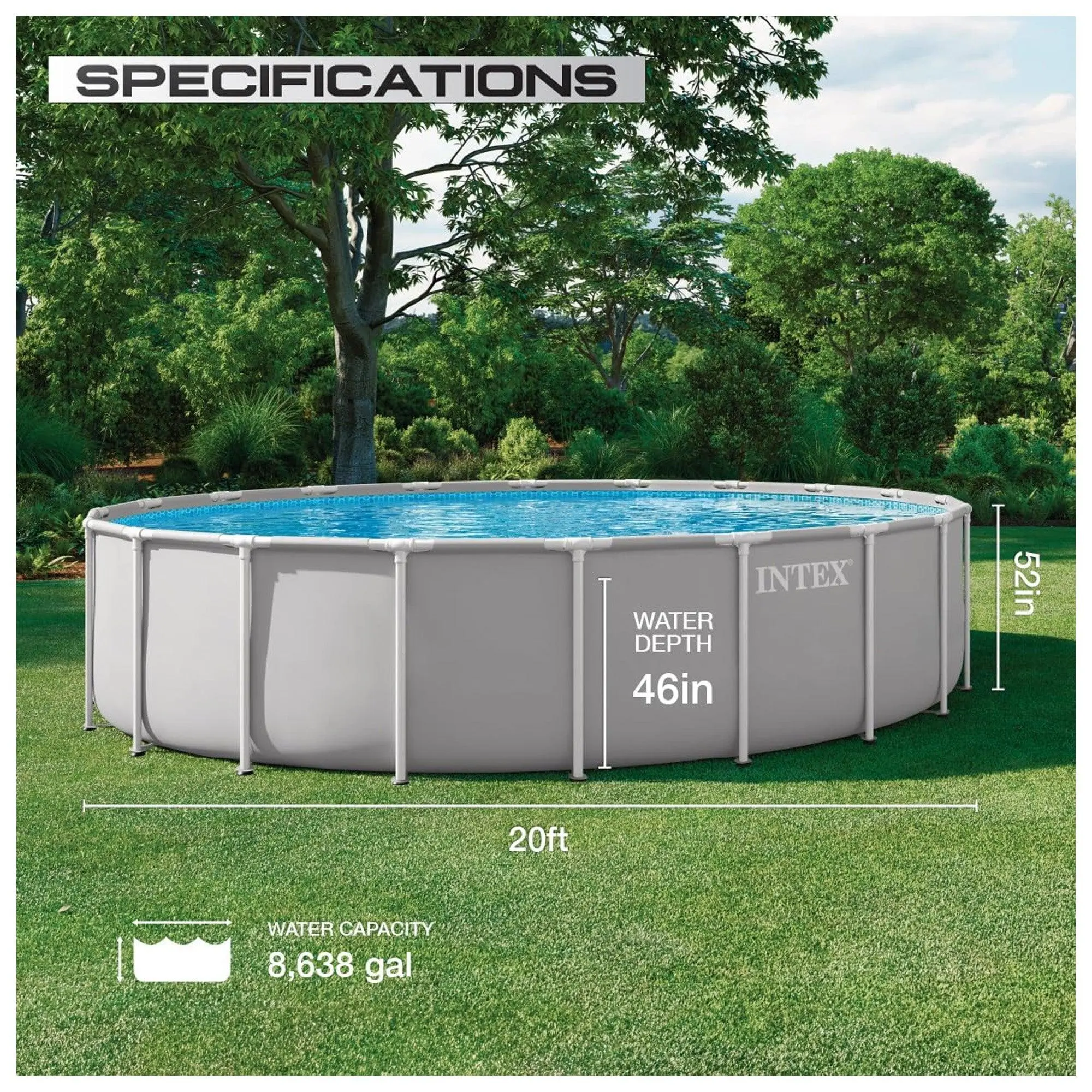 Intex 20ft x 52in round pool helps you beat the summer heat, holding up to 8,638 gallons of water