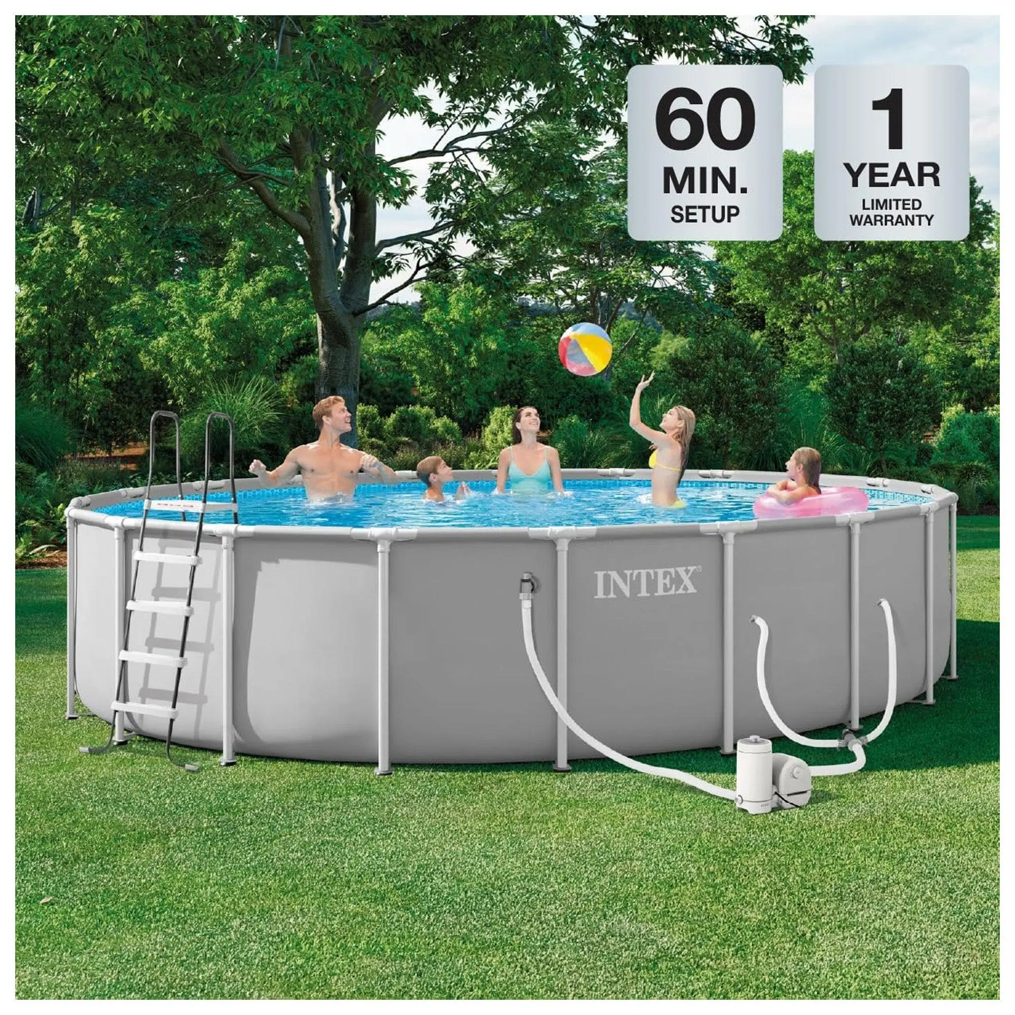 Brighten your backyard with this stylish and durable premium frame pool. Its advanced structure features oversized metal tubing with oval vertical supports for optimized frame strength. Simple T-joints meet those frame components with snap-to connectivity—no need for tools or pins! Thanks to its liner's standard 3-ply, puncture-resistant laminate material, your Prism Frame pool is ready to keep the good times rolling for you and your loved ones.