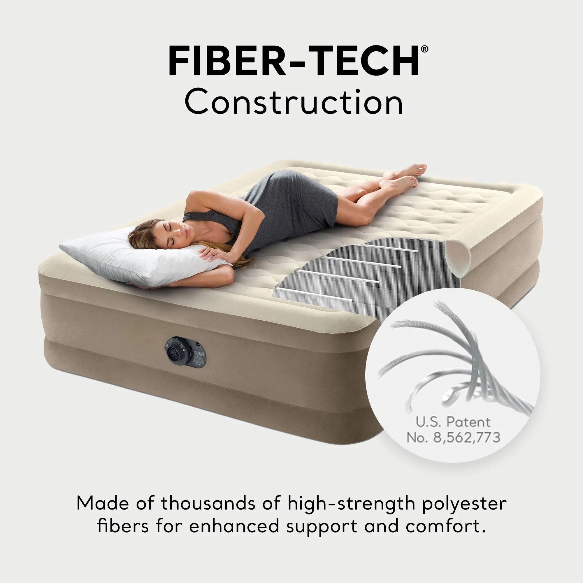 Comprised of thousands of high-strength polyester fibers that provide enhanced comfort, stability, and support; Fiber-Tech Beam Construction can withstand more weight and pressure without losing its comfort or stability