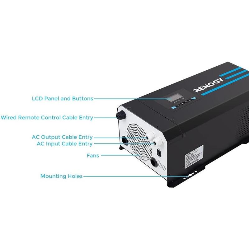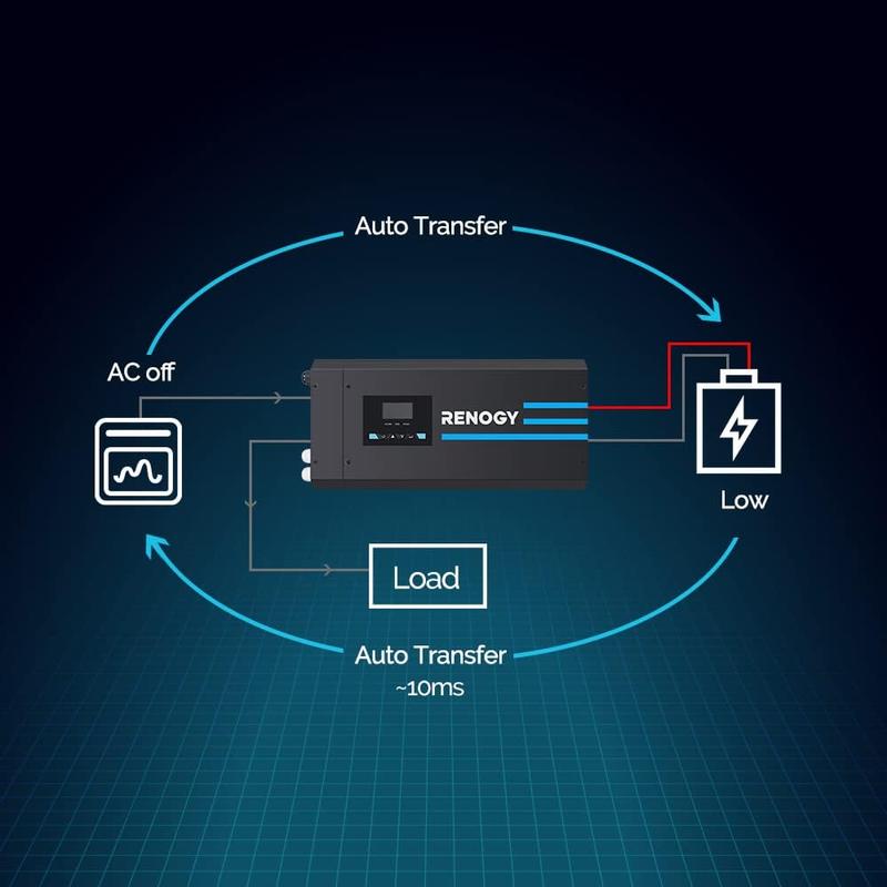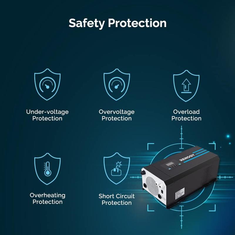 ·【4-STAGE CHARGING】 The Renogy 2000W pure sine wave inverter charger is equipped with a 4-Stage (Bulk stage, Boost stage, Float stage, and Equalization) battery charger, ensuring optimal and automatic charging to reach 100% capacity efficiently.