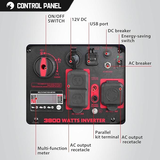 ·STEADY 3800W POWER FOR EMERGENCIES- This inverter generator delivers 3800W of stable output, powered by a 149cc 4-stroke OHV single-cylinder gas engine with a forced air cooling system. It's a reliable energy source for essential appliances during home outages or bad weather events
