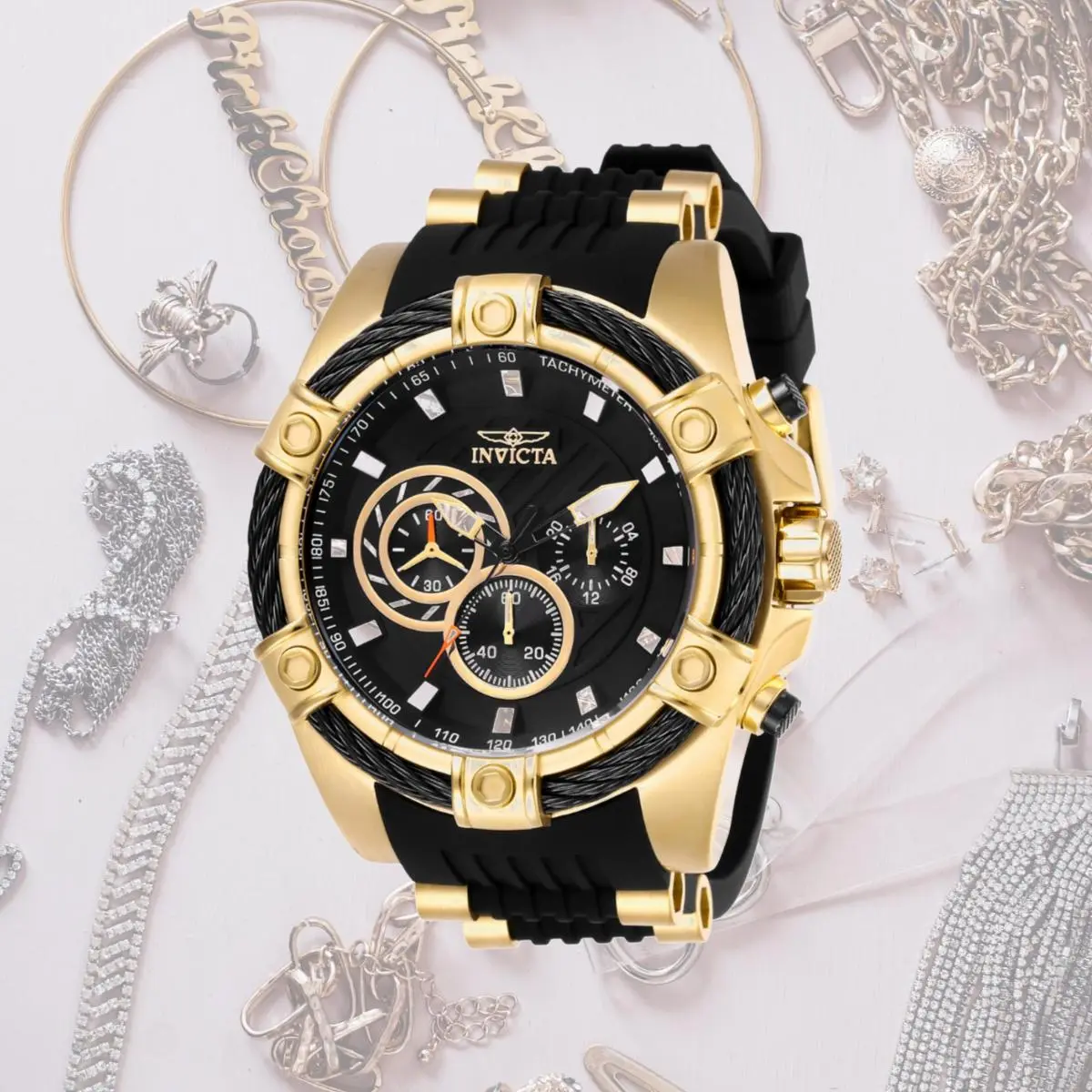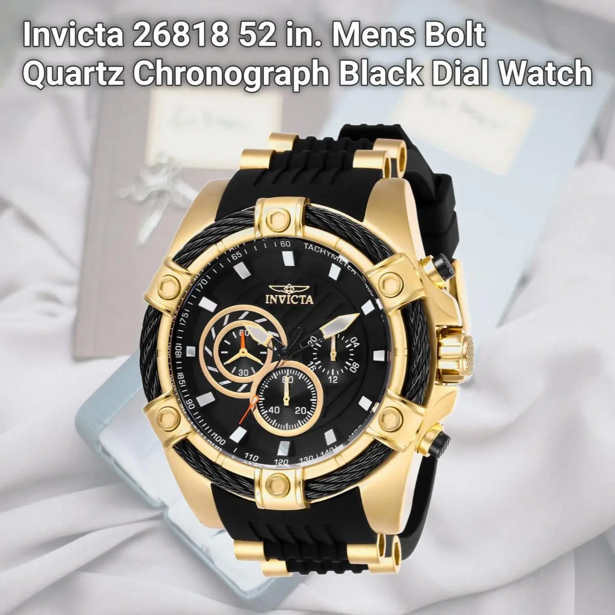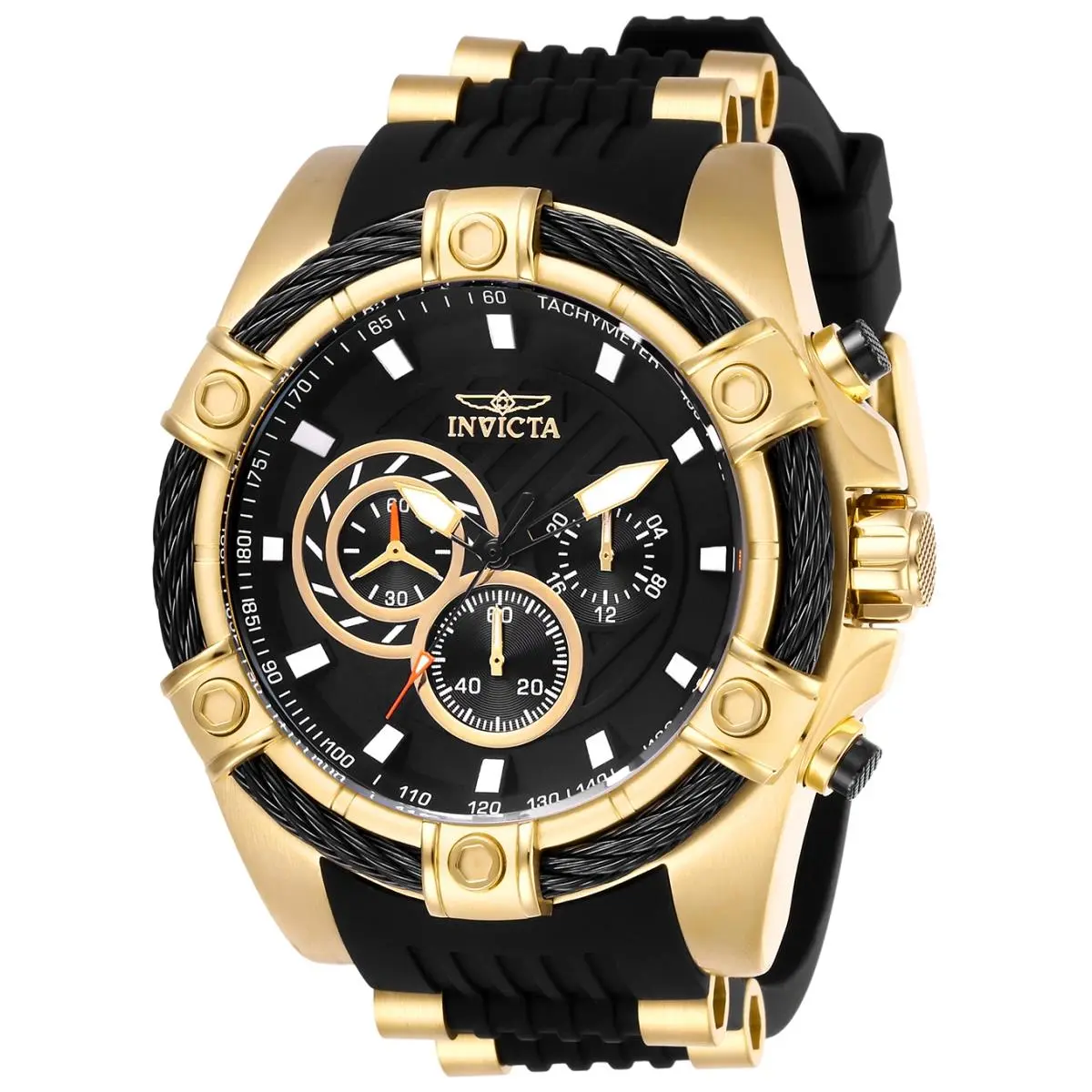We give our best to bring timepieces with innovation at its best. We use the latest technology and provide the best quality standards. We also have created the Invicta club to offer the loyal treatment for our most dedicated collectors. New designs and stylish masterpieces have been carefully selected and modified to capture the unique style and aesthetics of the watches. Our create work with the quest of creating something exceptional. With sharpness in attitude and ability, the Invicta Bolt is a mastermind of dominance. Perfectly synchronized movements, complex casing engineering and signature rope jewelry design fastened around the bezel make a lasting impression. Variations in materials and finishes provide a range of options to suit any taste. The Invicta Bolt, an uncompromised statement in accomplished timekeeping where power becomes harmonized motion. Specifications Collection: Bolt. Band Color: Black & Gold. Bezel Color: Black & Gold. Gender: Mens. Movement: Quartz. Case Diameter: 52". Strap Size: 26 mm. Water Resistant: 100 m. Band Material: Polyurethane & Stainless Steel. Dial Material: Metal. Bezel Material: Stainless Steel, Crystal. Case Material: Stainless Steel. Clasp Type: Fold over clasp with Safety. Crown Type: Pull. Country of Origin: Japan.