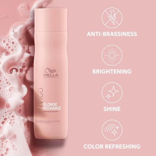 INVIGO Blonde Recharge Color Refreshing Shampoo, Cool Blonde. Refreshes and maintains the brightness and vibrancy of natural or highlighted blondes. This violet shampoo prevents natural or colored blonde hair from yellowing and helps eliminate brassiness, leaving it soft to the touch.