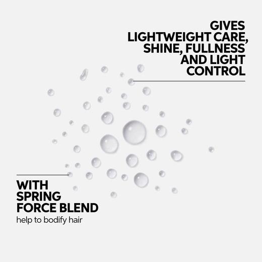 Mist for lightweight care, shine, fullness, and light control. With Volume Boost-Blend™: lightweight formulas give manageability and shine without weighing down even fine hair. Bodifying Spring Force Polymers surround the hair fibers, stabilizing them and helping to create the most voluminous looks during blow-drying. With Cotton Extract which is known as a soft but stable fiber that offers the same qualities to create voluminous fine hair.