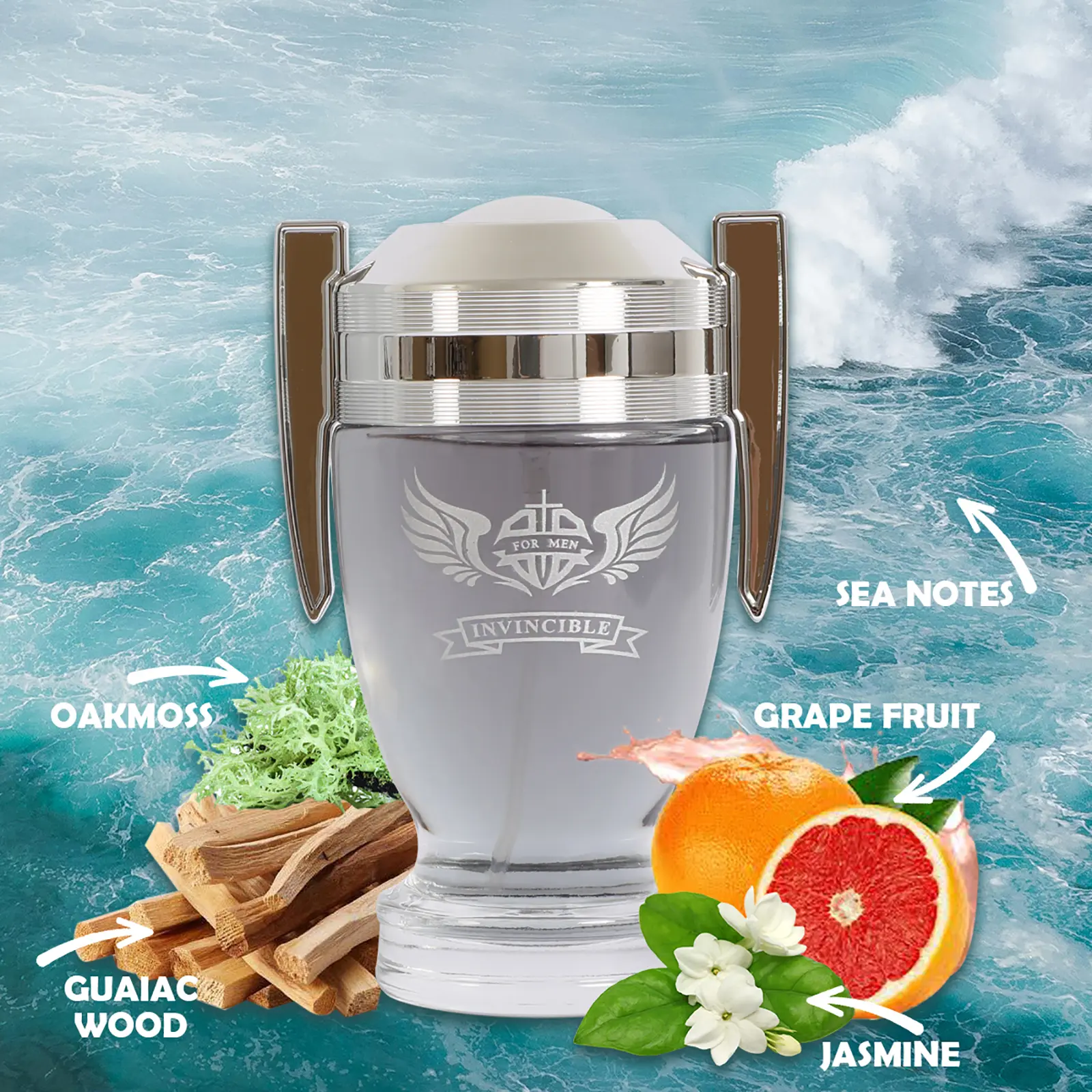 Crafted for men who crave adventure, Invincible opens with crisp Sea Notes, tangy Grapefruit, and zesty Mandarin Orange that energize the senses instantly.