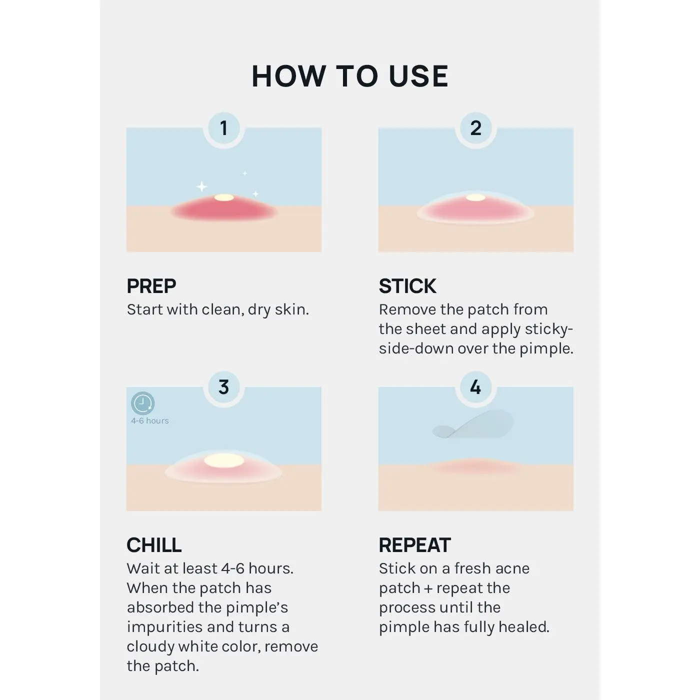 How to Use: Clean and Dry Skin. Take the Invisible Acne Patch and cover your pimple. Leave on for at least 4-6 hours (can be used overnight). Remove the patch when it has absorbed the impurities and turns a cloudy white color. Replace with a new patch if needed until the blemish has fully healed.