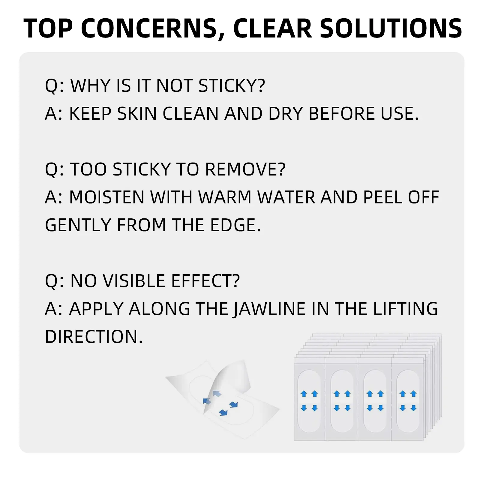Q: No visible effect? A: The angle and pull strength are key. Please refer to our updated video demonstrations to find the perfect lift for your face shape.