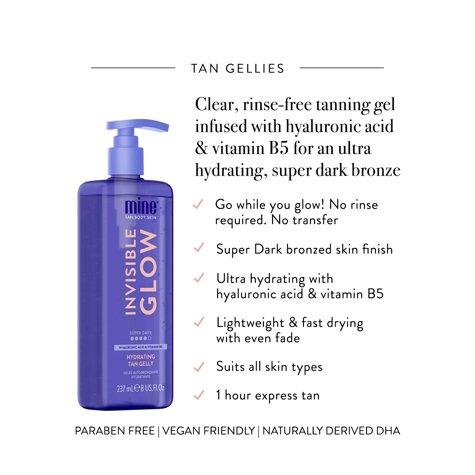 Invisible Glow Super Dark Hydrating Tan Gelly suits all skin types and tones for those looking for ultra hydrating, quick bronzed results in as little as 1 hour.