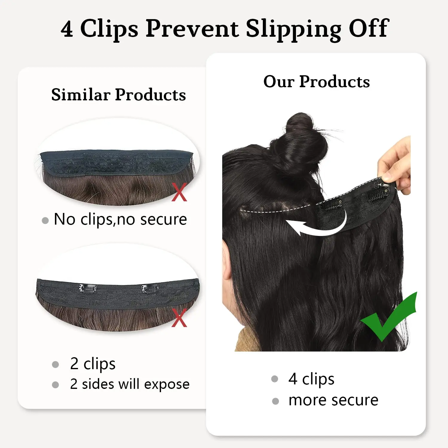 Ā·Easy to Wear: Simply separate your hair above your ears, about 1-1.5 inches from your hairline, and leave it on top. Place the hooks in different positions to adjust the size to your head, then place the extensions with the wire in the back. Use your own hair to hide the wire.