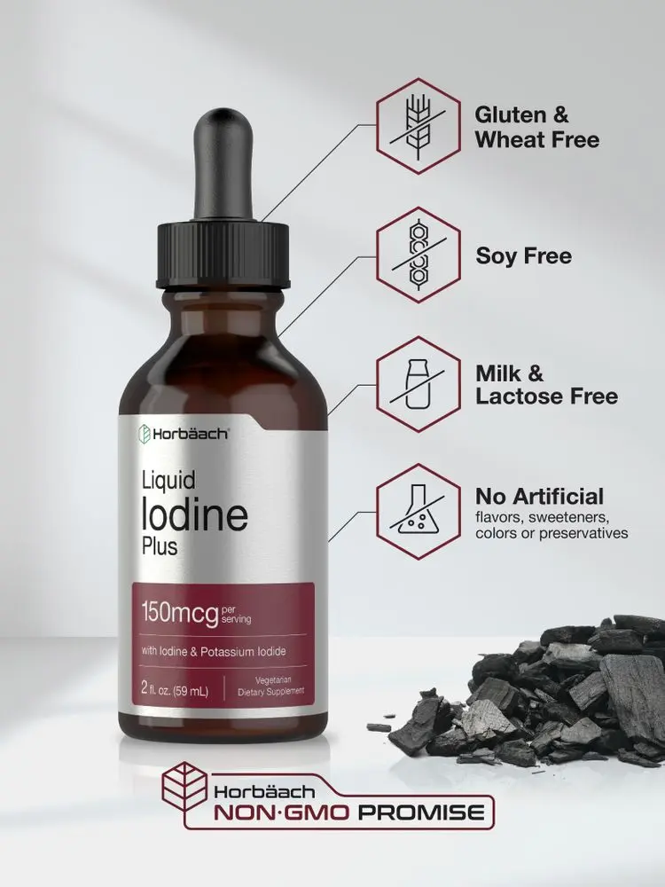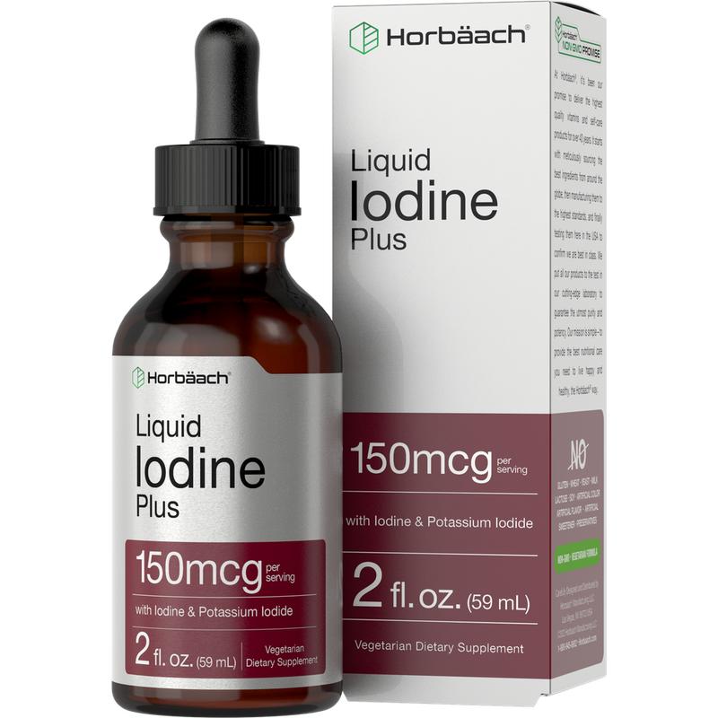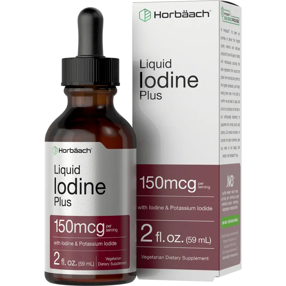 Horbaach Liquid Iodine Plus 2 fl oz is blended in a base of water (and is clear and without color) to provide a 150 mcg dose that is ideal for ingestion.