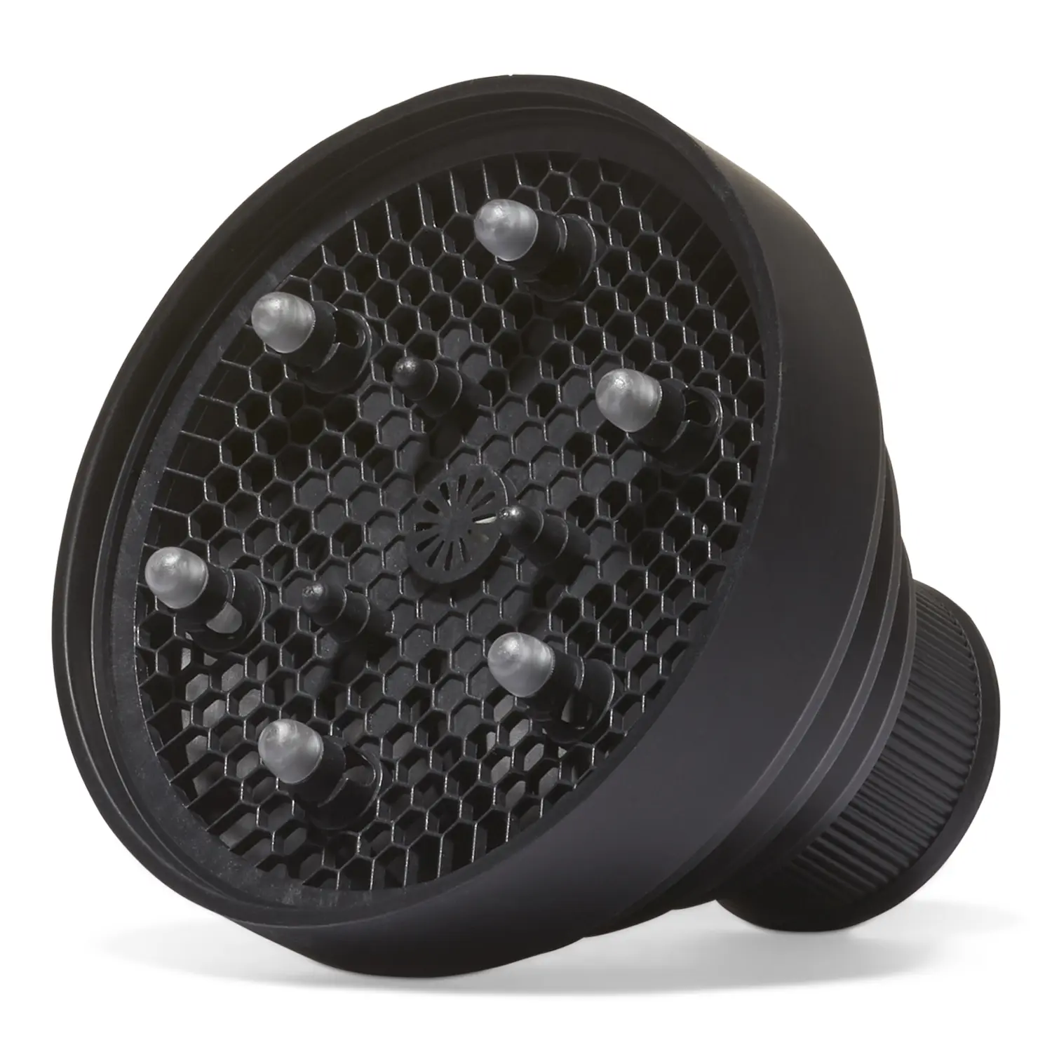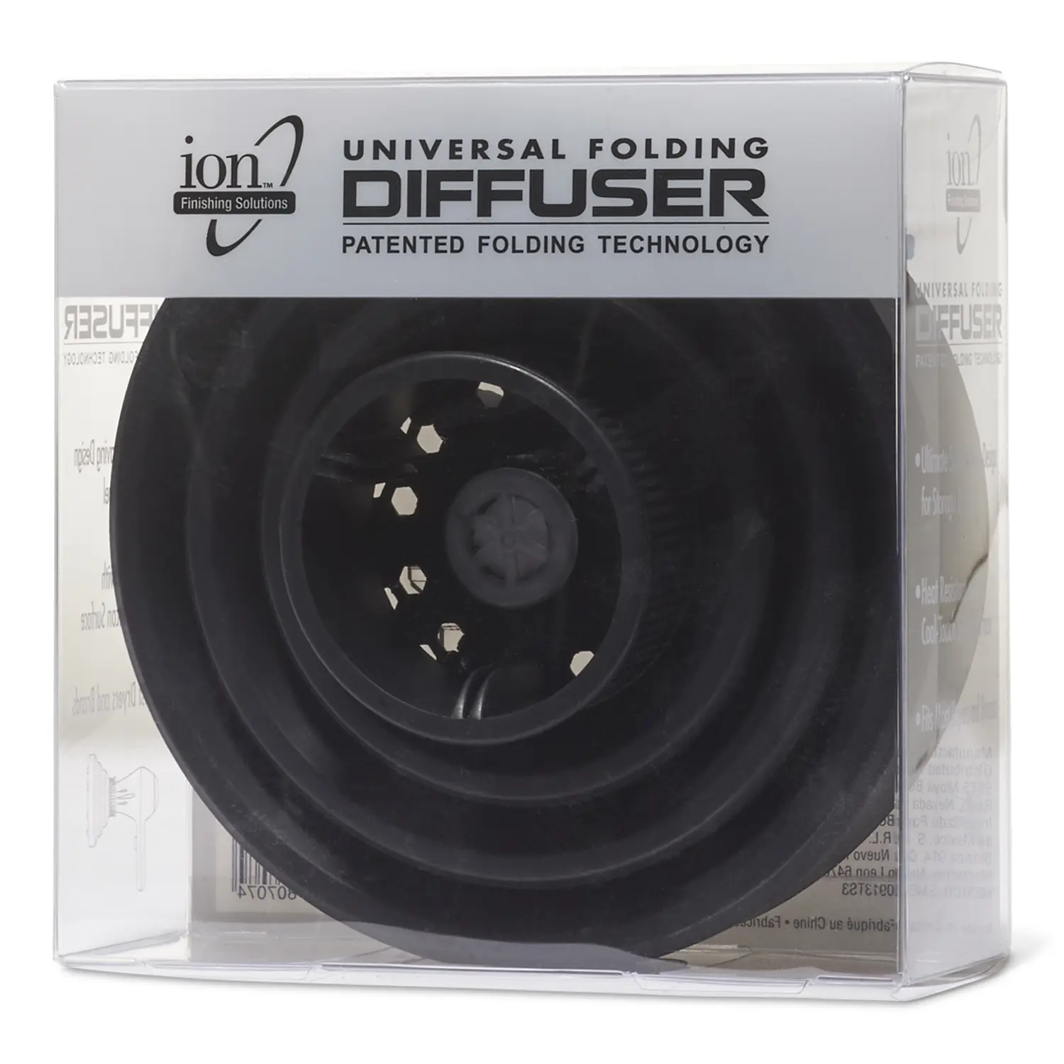 An ion Black Universal Diffuser gives hair the ultimate blow drying experience! This heat resistant diffuser features a cool touch silicon surface ensuring that hair can be styled with heat up to 450°F. It has the ultimate space saving design that is great for storage or travel. Fits almost any dryer or brand.