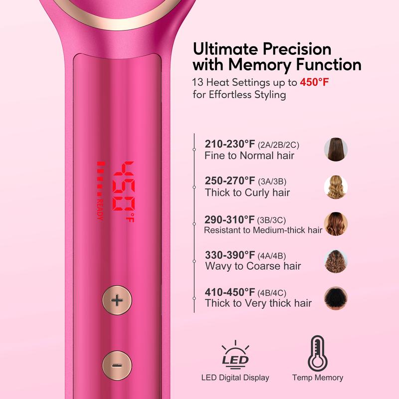 · ✨ 13 Heat Settings: The brush comes with an adjustable temperature range of 210°F to 450°F for all hair types. It also has a digital display that shows the temperature level.