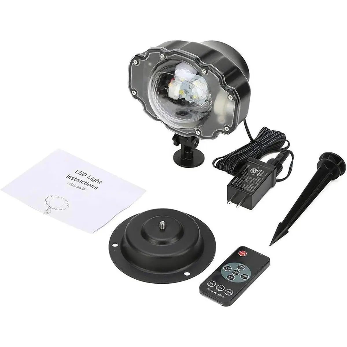 WIRELESS RF REMOTE: Each light is equipped with a multi-functional RF remote, which has On/Off, Flash+/Flash-, Motor+/Motor-,Reset, 2hrs, 4hrs, 6hrs buttons, can change snowfall modes or rotate speed, also can time the light of 2 hours, 4 hours or 6 hours, light will auto turn off.