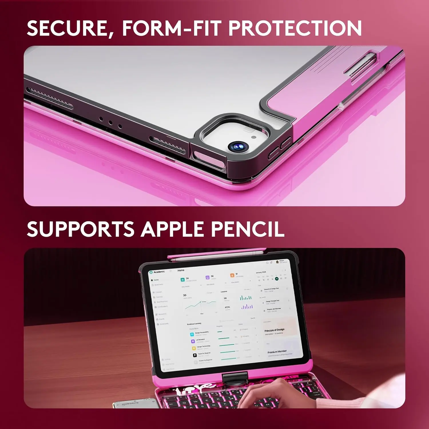 Show off your iPad’s sleek design with the transparent hard case that guards against drops and scratches thanks to reinforced edges. Plus, the magnetic pencil holder keeps your Apple Pencil safe and charged wirelessly, so it’s always ready when inspiration strikes. The Type-C fast charging powers your keyboard in just 2 hours, lasting up to 30 days on a single charge.