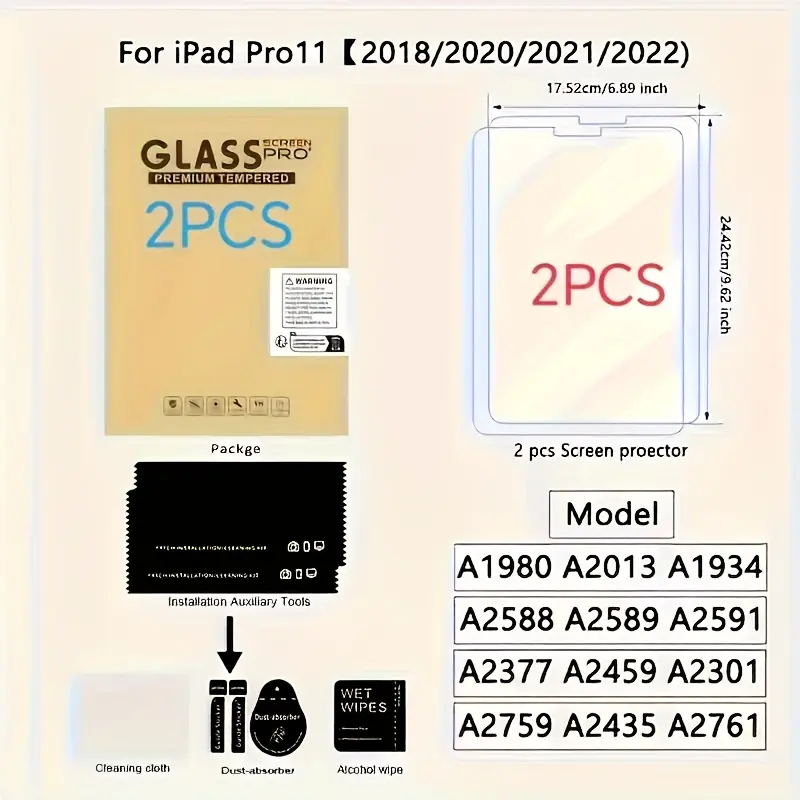 2-piece high-definition tempered glass screen protector suitable for iPad Pro 11 inches (2018-2022), scratch resistant, 9H hardness, easy to install, display screen protective cover, high-definition film, durable glass