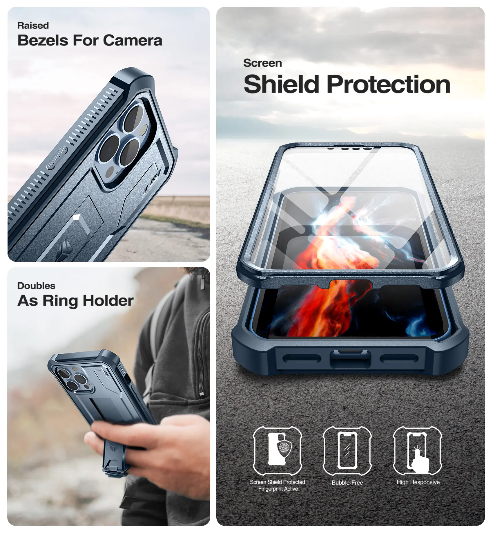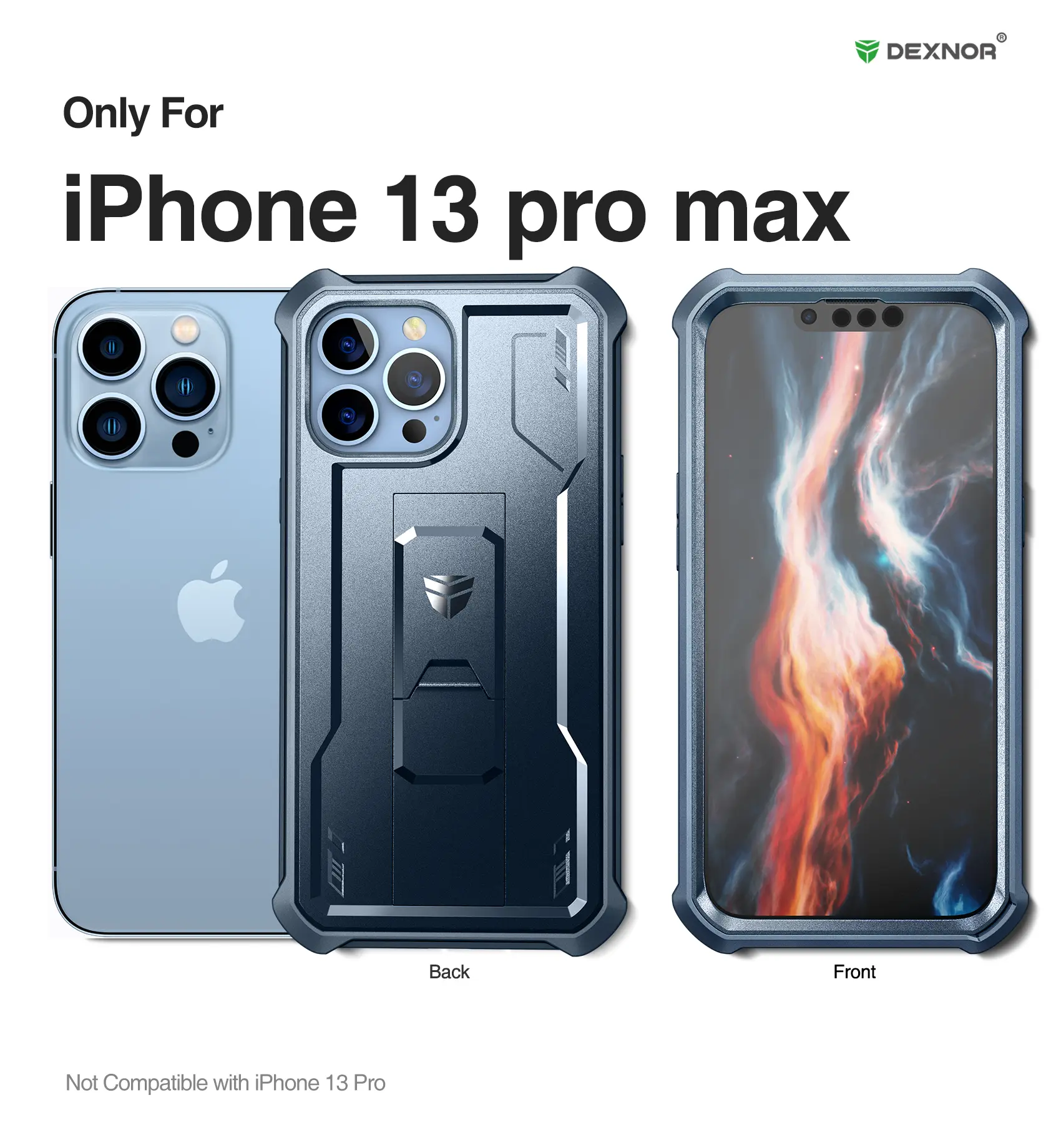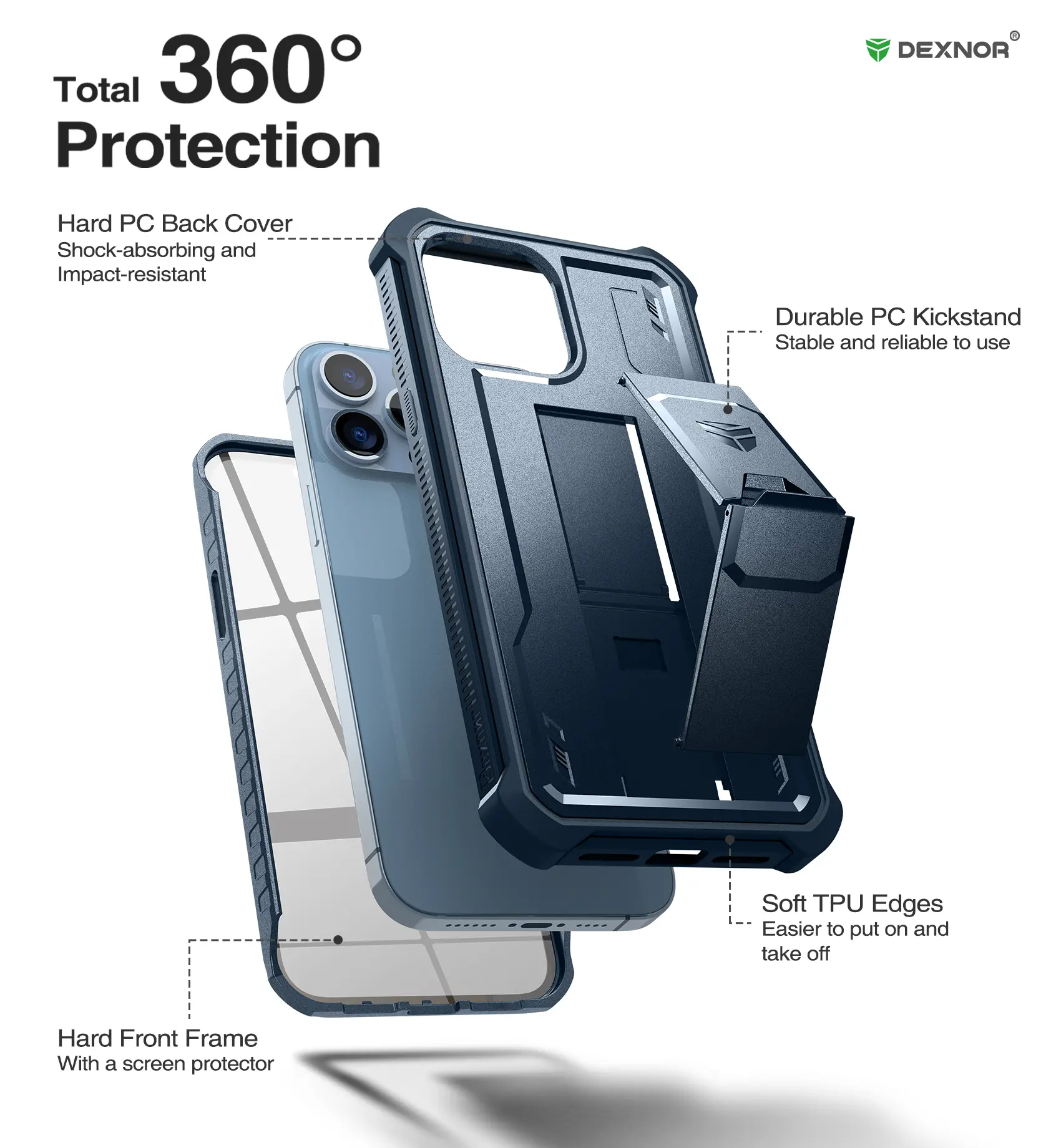 Choose from stylish colors like Black, Rose Gold, Navy Blue, Green, or Blue to match your vibe. Inside the box, you get the Dexnor protective case with built-in screen protector and kickstand, ready to keep your iPhone 13 Pro Max safe and stylish.