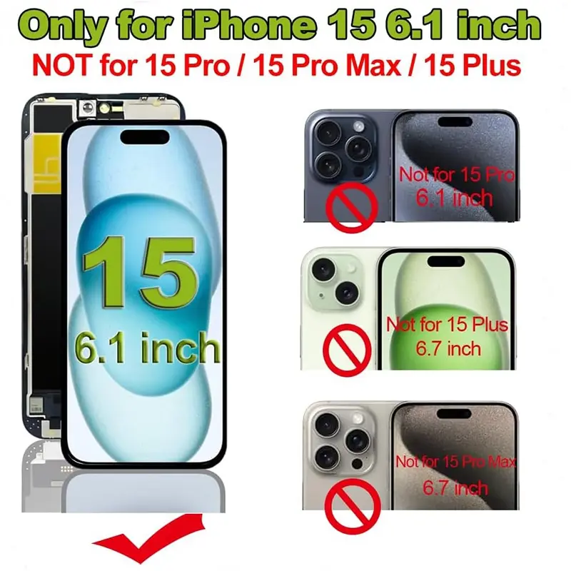 1.Compatible with: ONLY for iPhone 15 screen replacement with (Model A2846, A3089, A3092, A3090 ) (6.1 inch). Please DO NOT use it on 15Pro or any other models.
