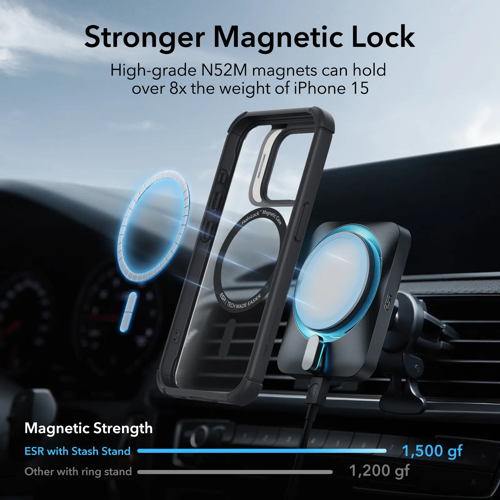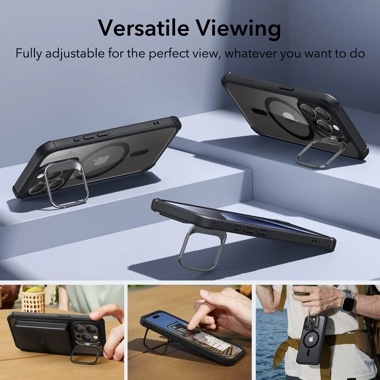 The kickstand is fully adjustable between 15° and 85°. It ensures the perfect angle for watching shows. The strong magnetic lock has 1,500 g of holding force for secure HaloLock or MagSafe accessories.