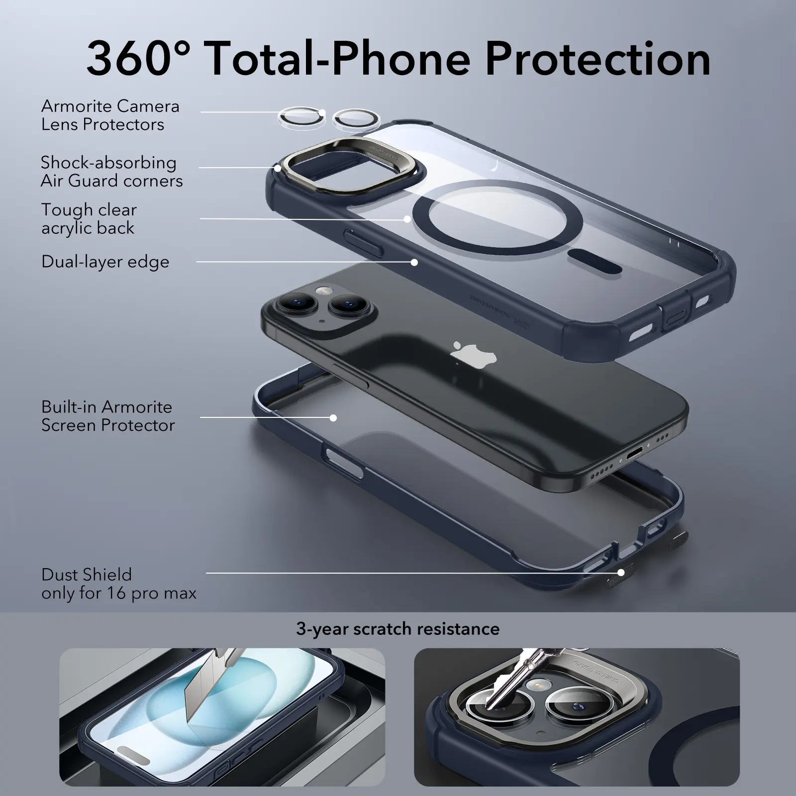 Hard acrylic back case with shock-absorbing Air-Guard corners. Integrated screen guard and tempered-glass protector offer military-grade protection. A camera lens protector adds extra security.