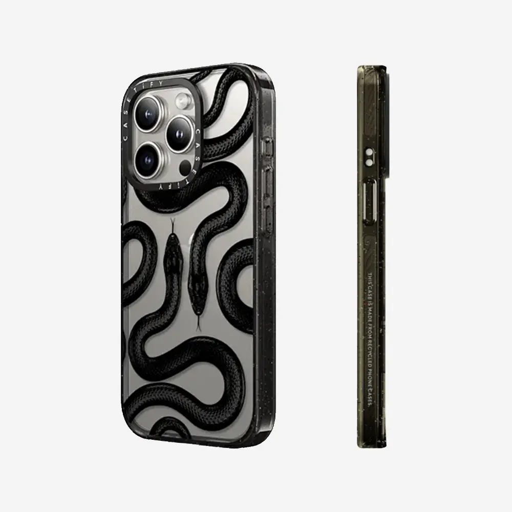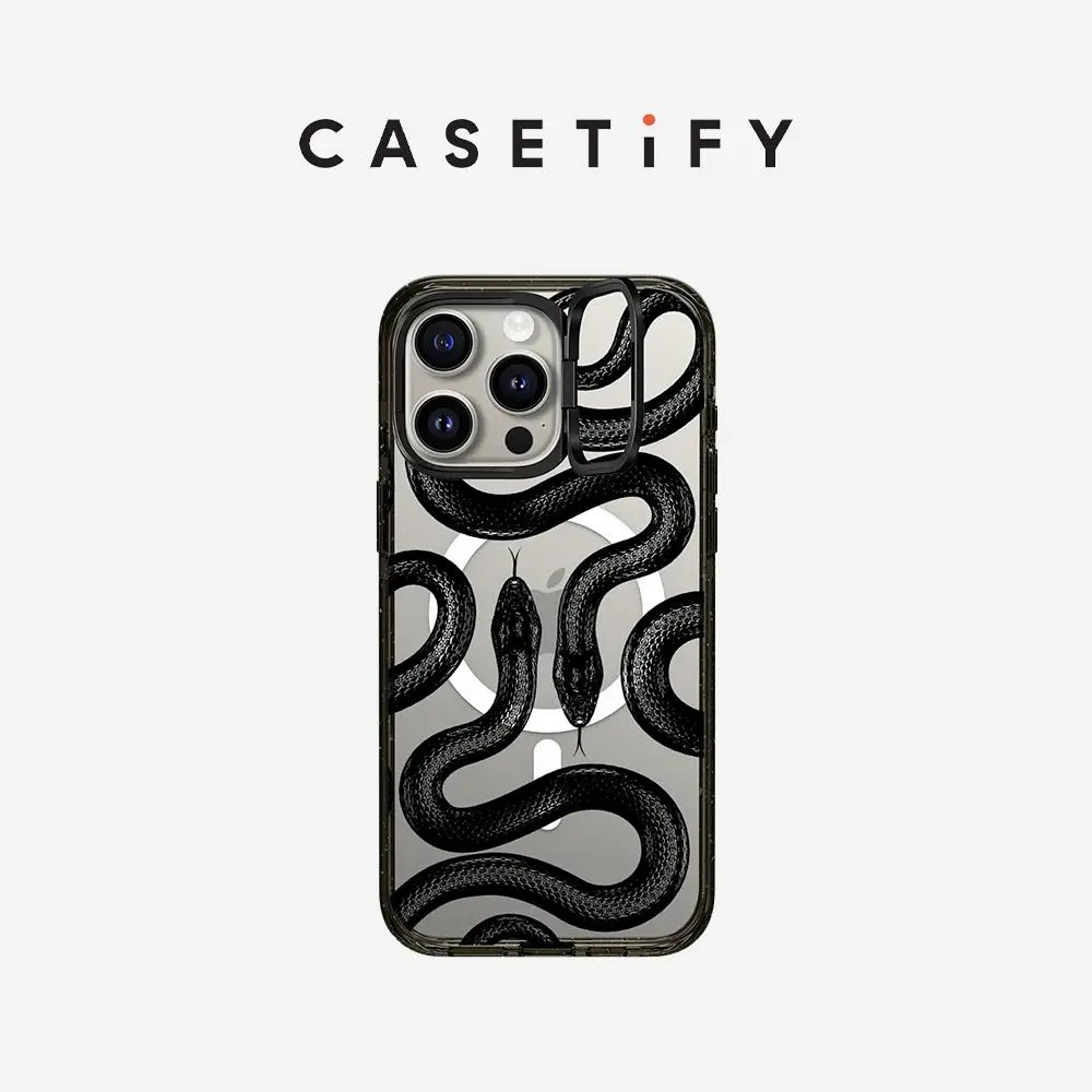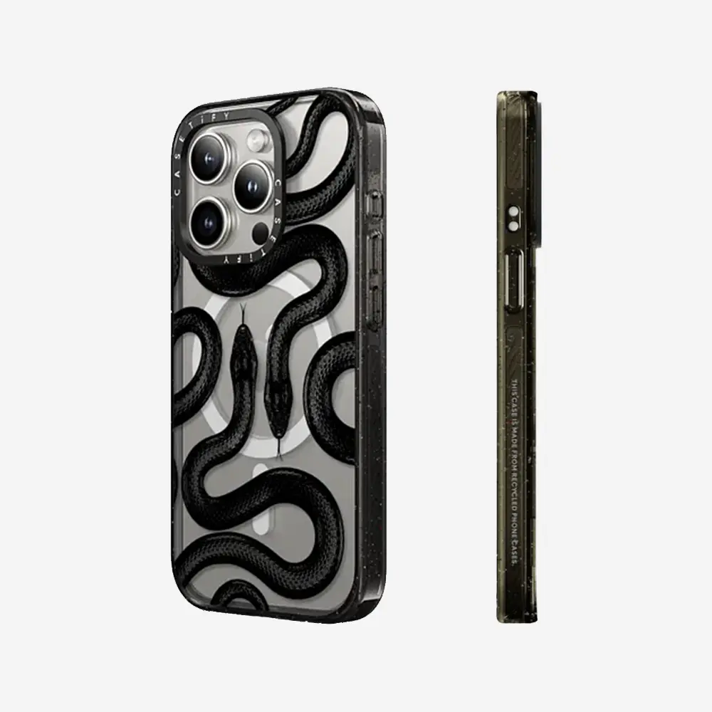 Ever drop your phone and cringe? The CASETiFY Black Kingsnake case has your back with military-grade MIL-STD 810G protection, guarding your iPhone from drops up to 8.2 feet. Crafted with eco-friendly EcoShock™ material, it absorbs shocks while being kind to the planet. Whether you have an iPhone 14, 15, or 16 series, this case fits like a glove and supports MagSafe wireless charging with handy side sockets so you never miss a beat. The built-in Impact Ring Stand is a game-changer, letting you watch videos hands-free with adjustable angles from 0 to 150 degrees—perfect for binge-watching or video calls. Plus, the raised camera ring adds extra defense for your lens with 6.6 feet of drop protection. Inside the box, you get the Black Kingsnake case featuring charm attachment points to personalize your look. Ready to protect your phone in style while staying eco-conscious? Grab your CASETiFY Black Kingsnake case today and experience durability, convenience, and customization all in one!