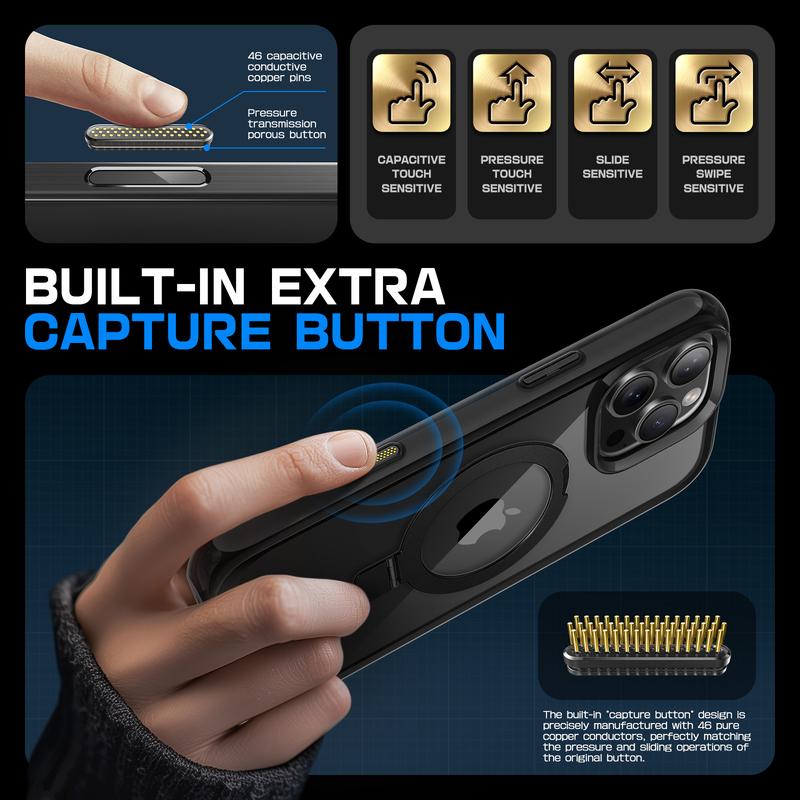 Ever fumble while trying to snap a quick photo on your iPhone? Meet your new favorite case with a handy camera control capture button that lets you take pictures effortlessly. This slim, clear case not only shows off your phone’s natural beauty but also protects it with military-grade shock absorption and elevated bezels that guard your screen and camera lens. The built-in aluminum kickstand offers multiple viewing angles and doubles as a ring holder for a secure grip. Plus, it’s MagSafe compatible with strong magnets tested to hold your wireless charger or car mount firmly in place. Made from eco-friendly materials that resist yellowing and scratches, this case is durable yet lightweight, perfect for daily use without bulk. It includes precise cutouts for easy access to all buttons and ports, making installation a snap. Ready to keep your iPhone safe and stylish? Grab this protective cover and enjoy peace of mind wherever you go!