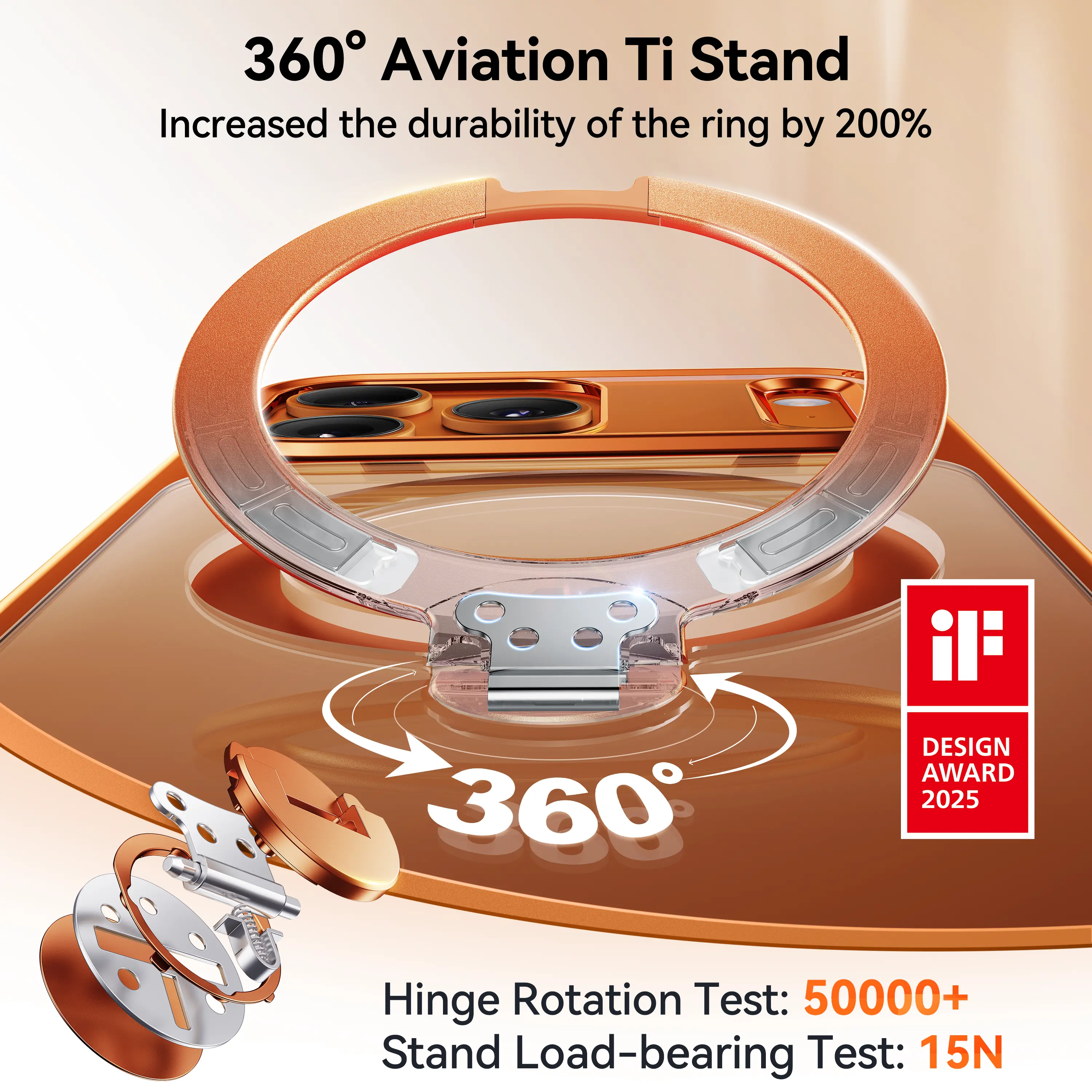 ·ăPioneering 360° Spin Stand - iF Design Award WinnerăMade from high-quality 9H+ aerospace titanium and nano diamond coating material with high-temperature forging. Undergoing 50,000+ rotation tests, The newly upgraded four-way locking titanium frame has increased the durability of the ring by 200%. Upgraded with horizontal adjustability based on vertical adjustment. Place it in landscape mode for watching movies which is adjustable to prevent screen glare.ă180-Day Warrantyă