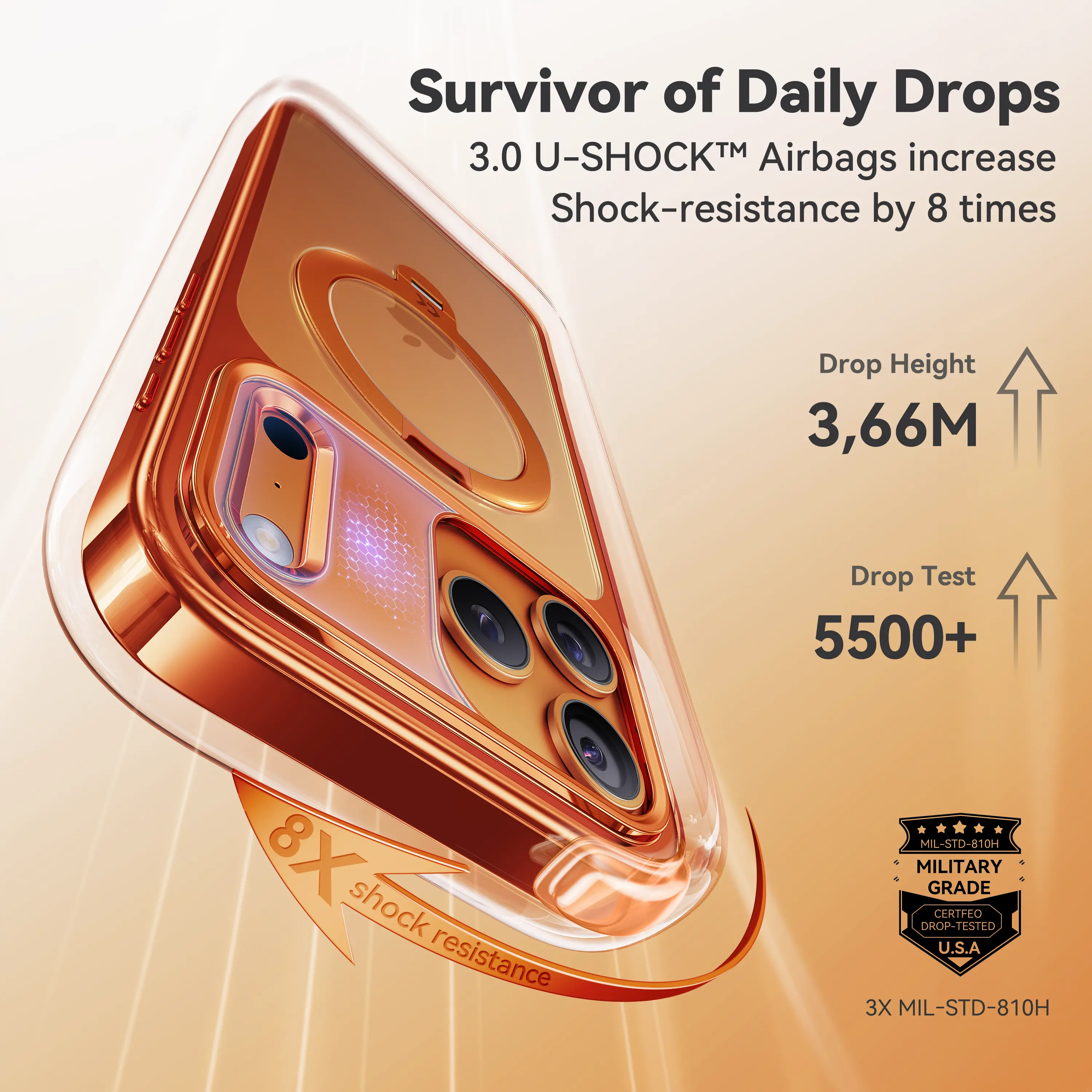 ·ă17FT Military Grade ProtectionăAdvanced TPU material with 3.0 U-SHOCK Airbags for shockproof protection, tested for drops up to 17 feet. Raised 2.5 mm camera edges and 1.5mm screen edges protect the camera. 6.00 cmÂČ area cover effectively prevent scratching.